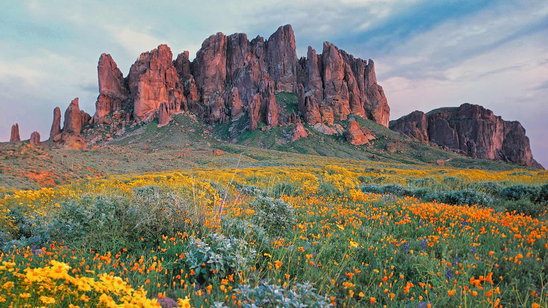Wildflowers in bloom at Lost Dutchman State Park in Arizona (© Tim Fitzharris/Minden Pictures) - Bing Wallpaper on March 6, 2019