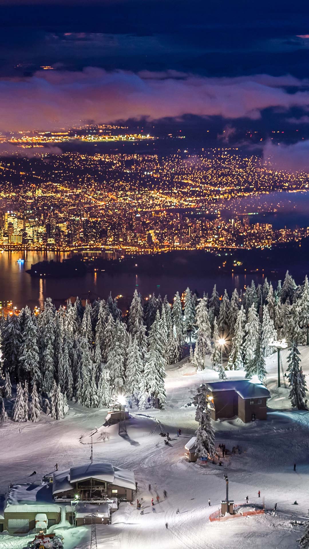 City lights from the snowy peak of Grouse Mountain at twilight, Vancouver (© Pierre Leclerc Photography/Getty Images) - Bing Wallpaper on January 5, 2020