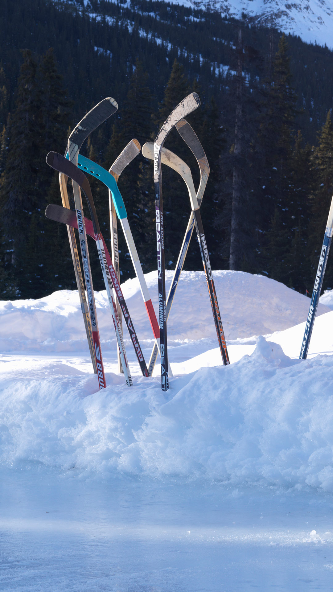 Ice hockey sticks in snow, Banff, Alta. (© Ascent/PKS Media Inc./Getty Images) - Bing Wallpaper on January 9, 2020
