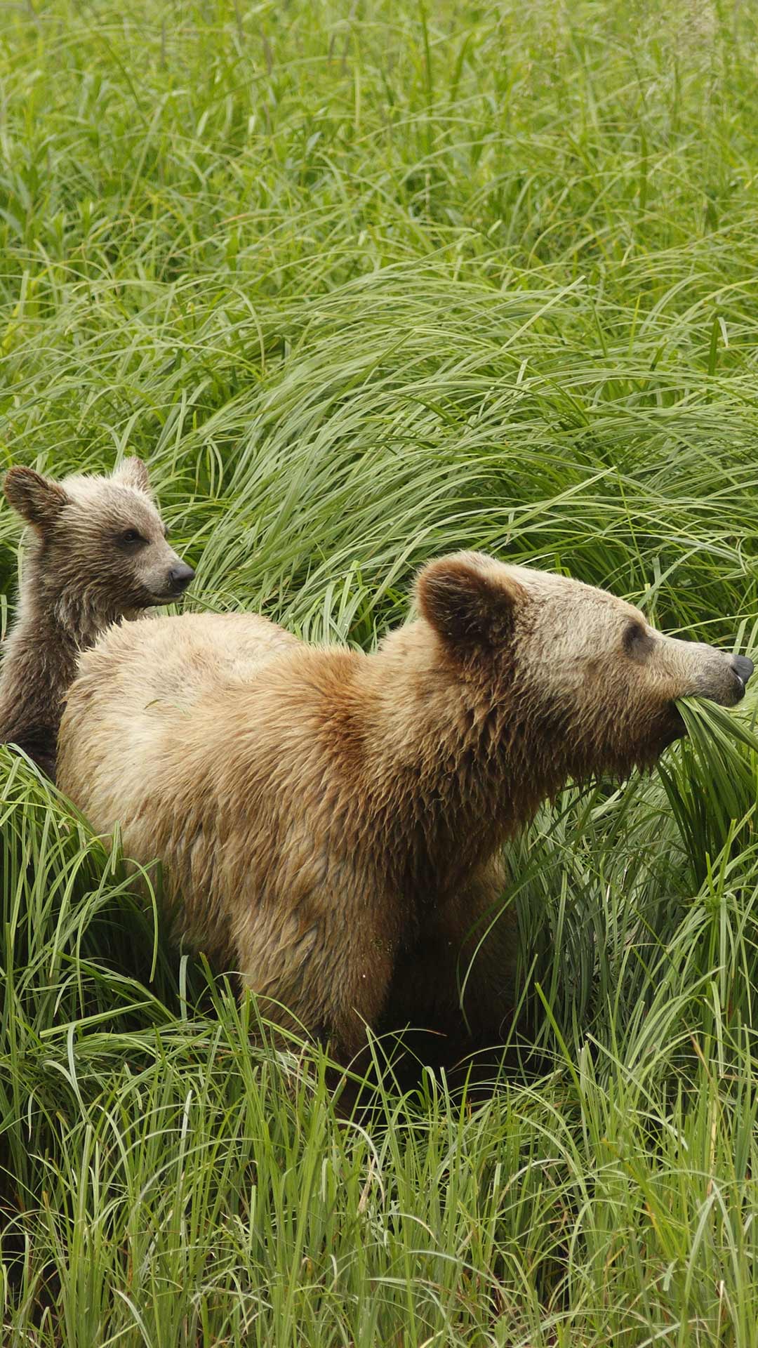 Adult female Grizzly Bear (Ursus arctos horribilis) and cub feeding on sedges in Great Bear Rainforest, B.C. (© Jack Chapman/Minden Pictures) - Bing Wallpaper on July 13, 2020