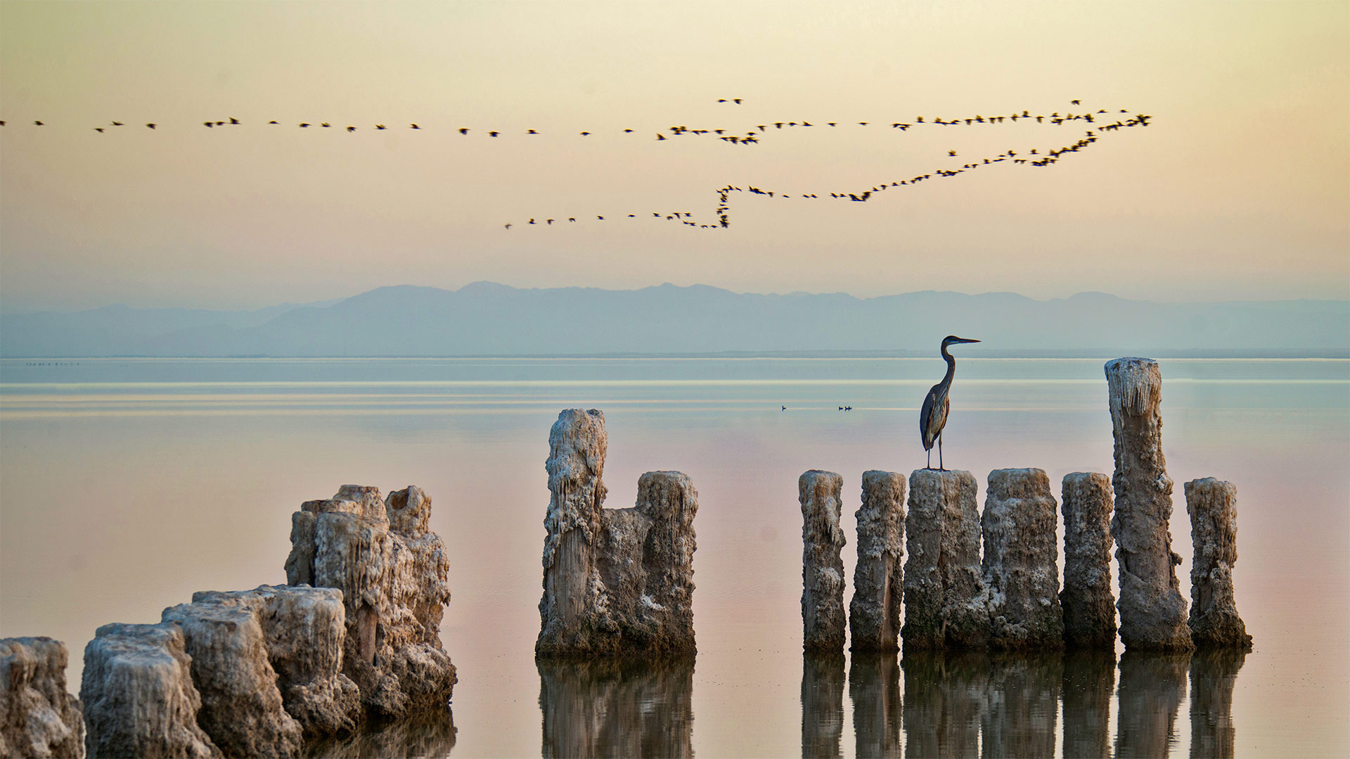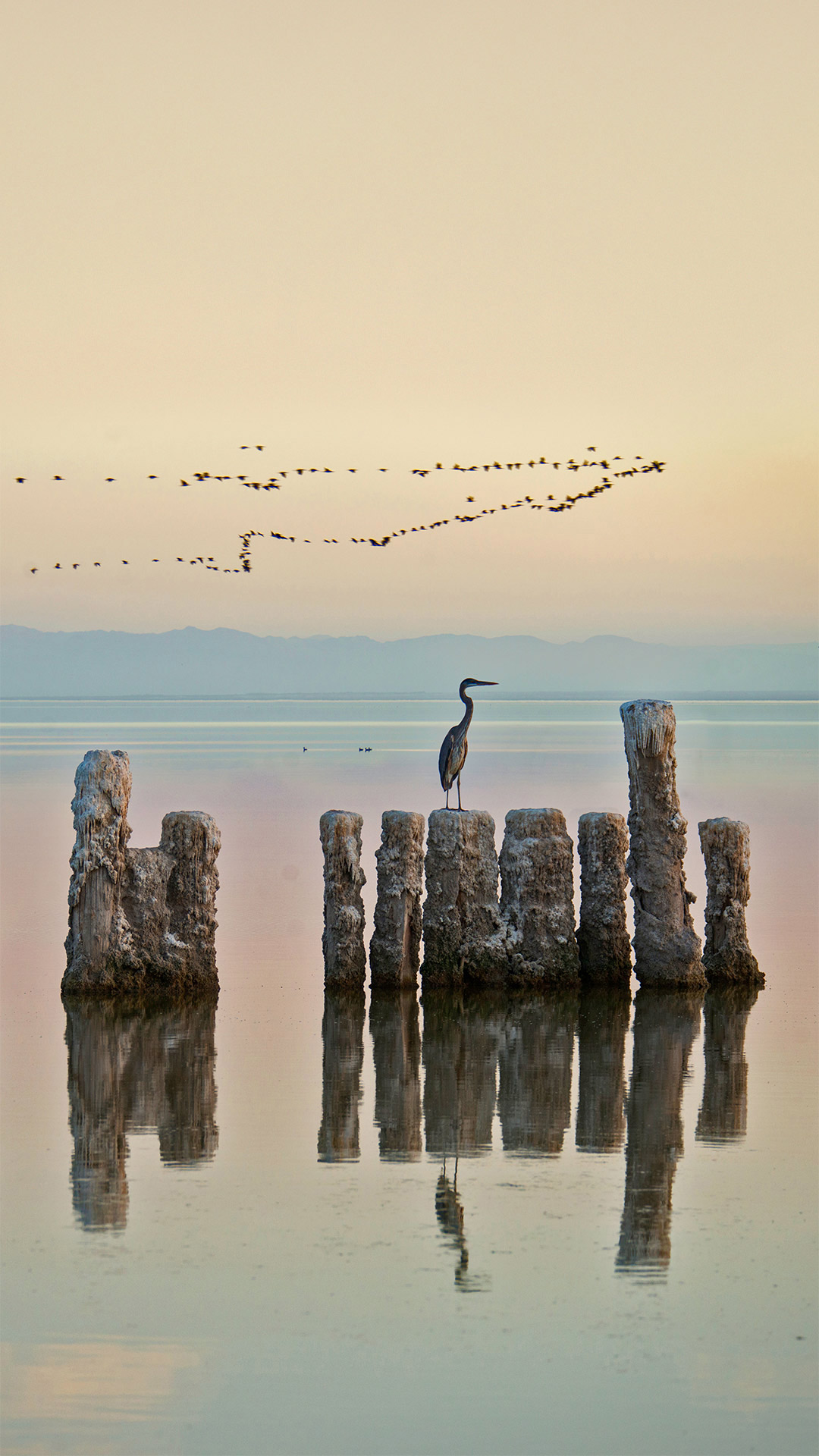 一只苍鹭栖息在加利福尼亚索尔顿海的木桩上 (© Garret Suhrie/Cavan Images) - Bing Wallpaper on March 19, 2020