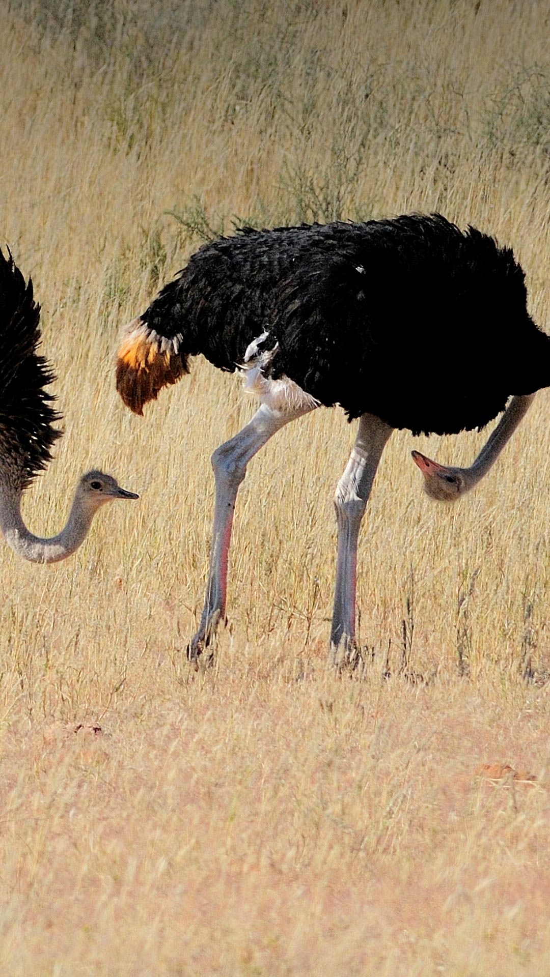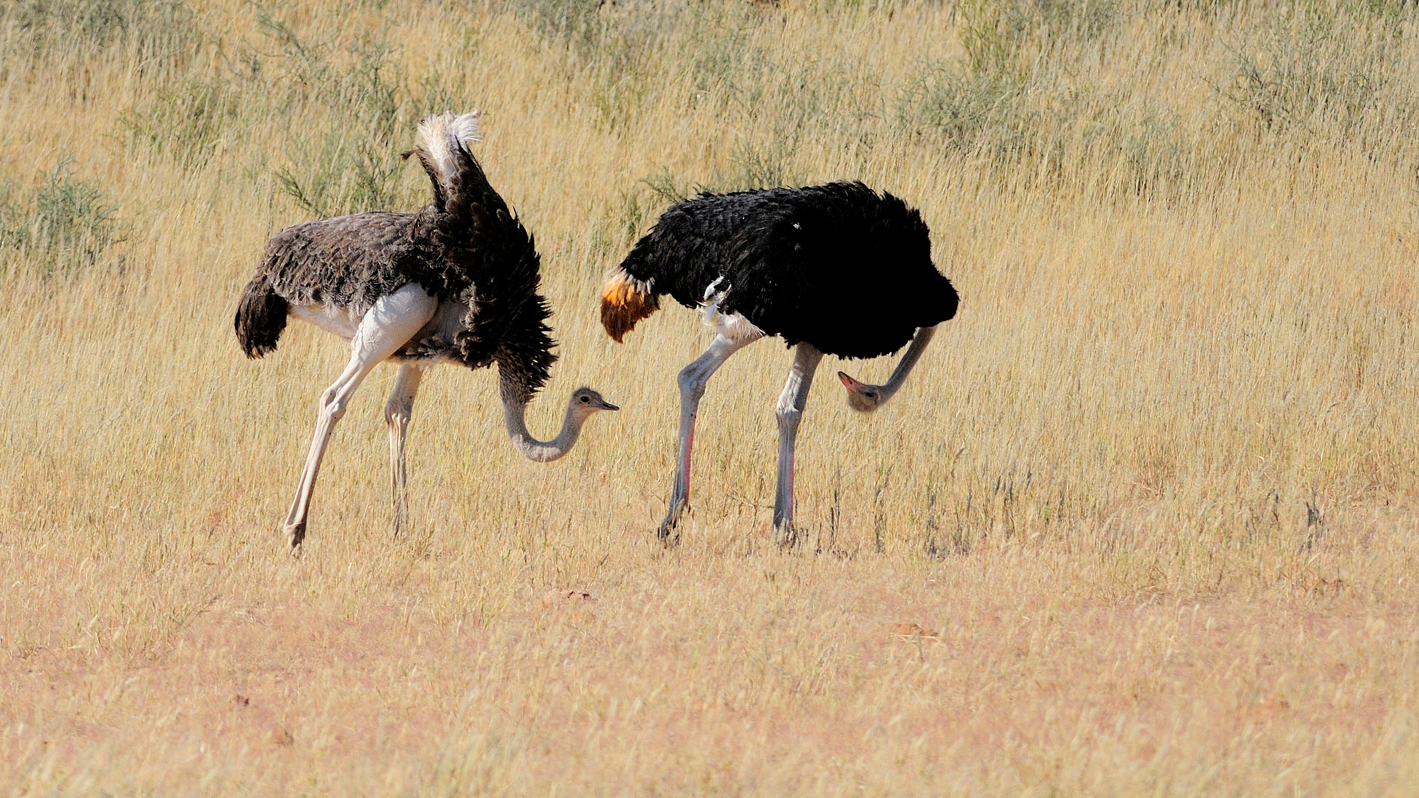 卡格拉格帝边境公园中一对正在求偶的鸵鸟,南非 (© Tina Malfilatre/Minden Pictures) - Bing Wallpaper on March 31, 2021