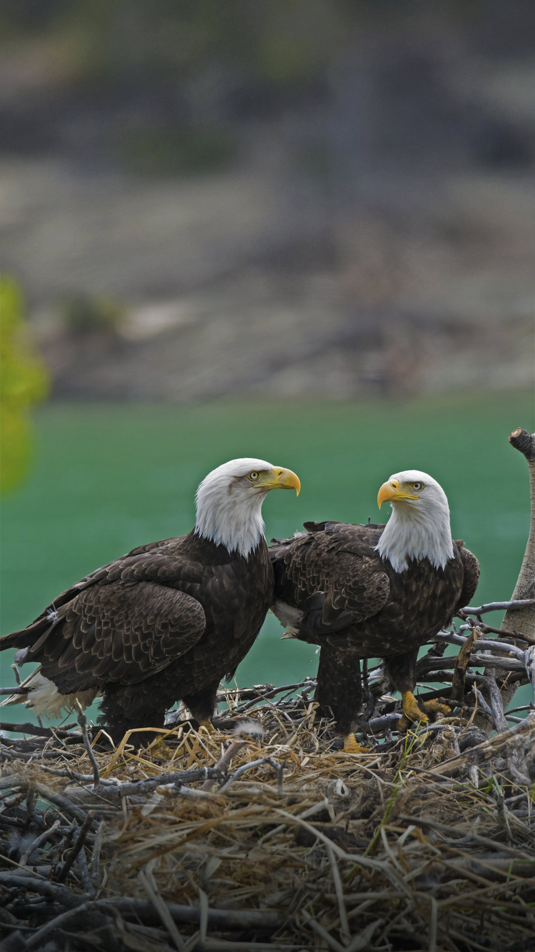 育空河附近巢穴中的一对白头海雕和雏鹰,加拿大育空 (© Mark Newman/Minden Pictures) - Bing Wallpaper on June 19, 2021