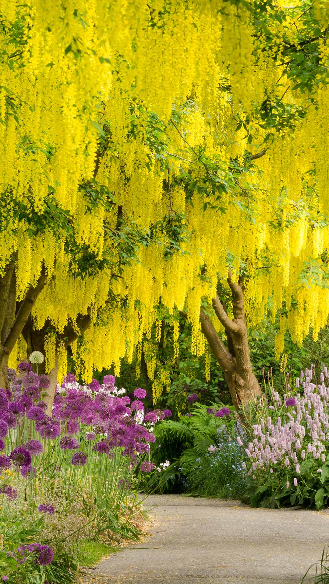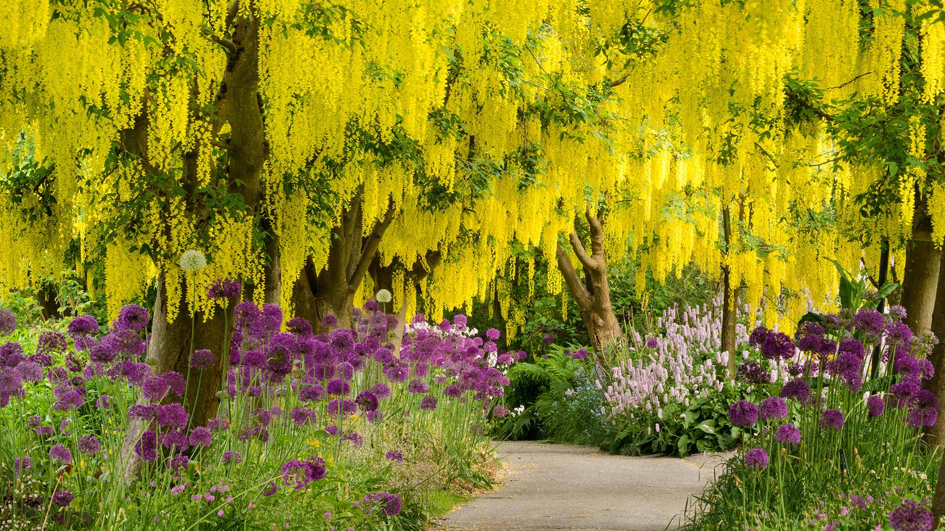 盛开的金链花树和紫色葱属植物,加拿大温哥华范度森植物园 (© Greg Vaughn/Alamy) - Bing Wallpaper on April 30, 2022