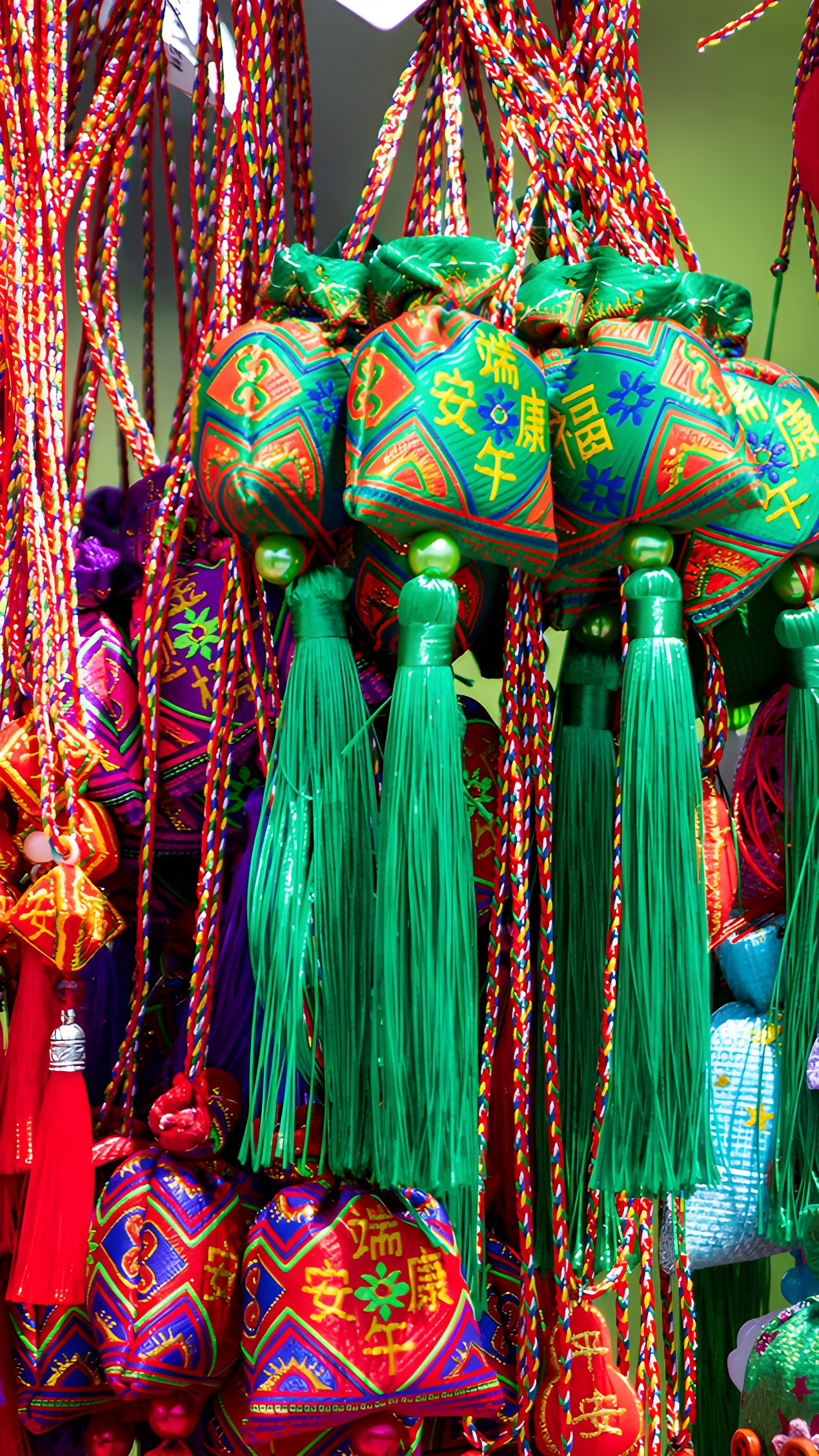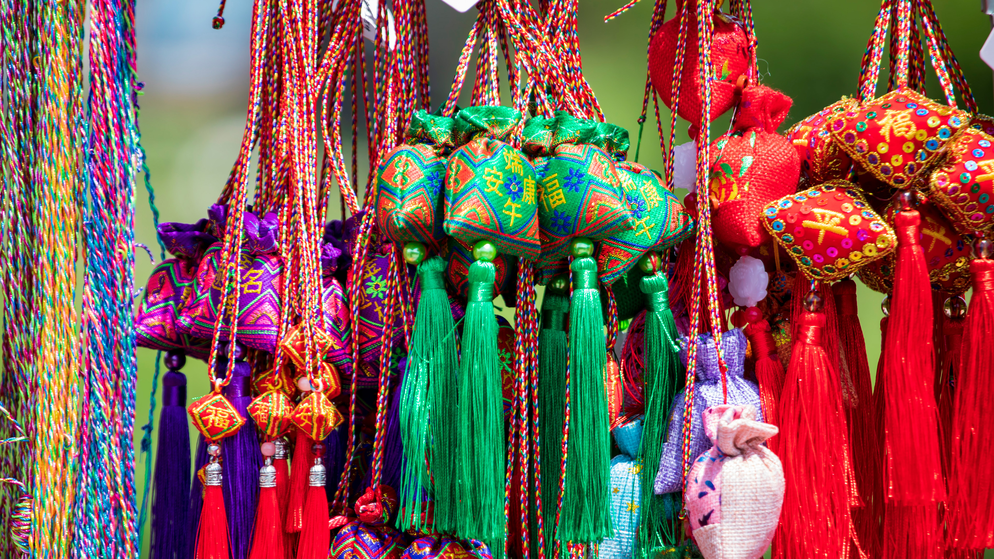 用彩色丝线串成的香囊,端午节前夕的庙会上,吉林省吉林市,中国 (© Visual China Group/Getty Images) - Bing Wallpaper on May 30, 2025