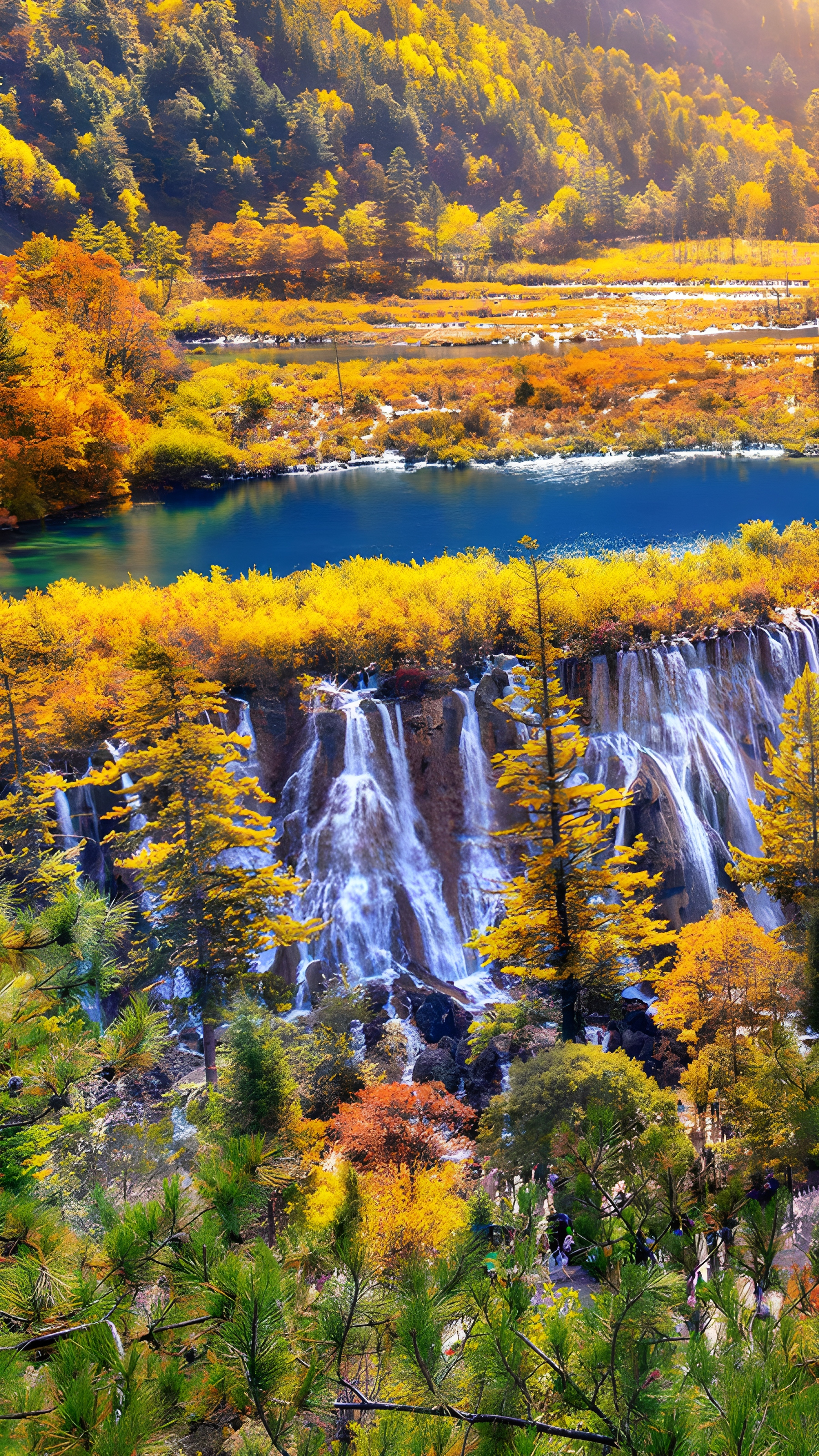 秋季九寨沟国家公园里的诺日朗瀑布, 四川省, 中国 (© tawatchaiprakobkit/Getty images) - Bing Wallpaper on August 22, 2025
