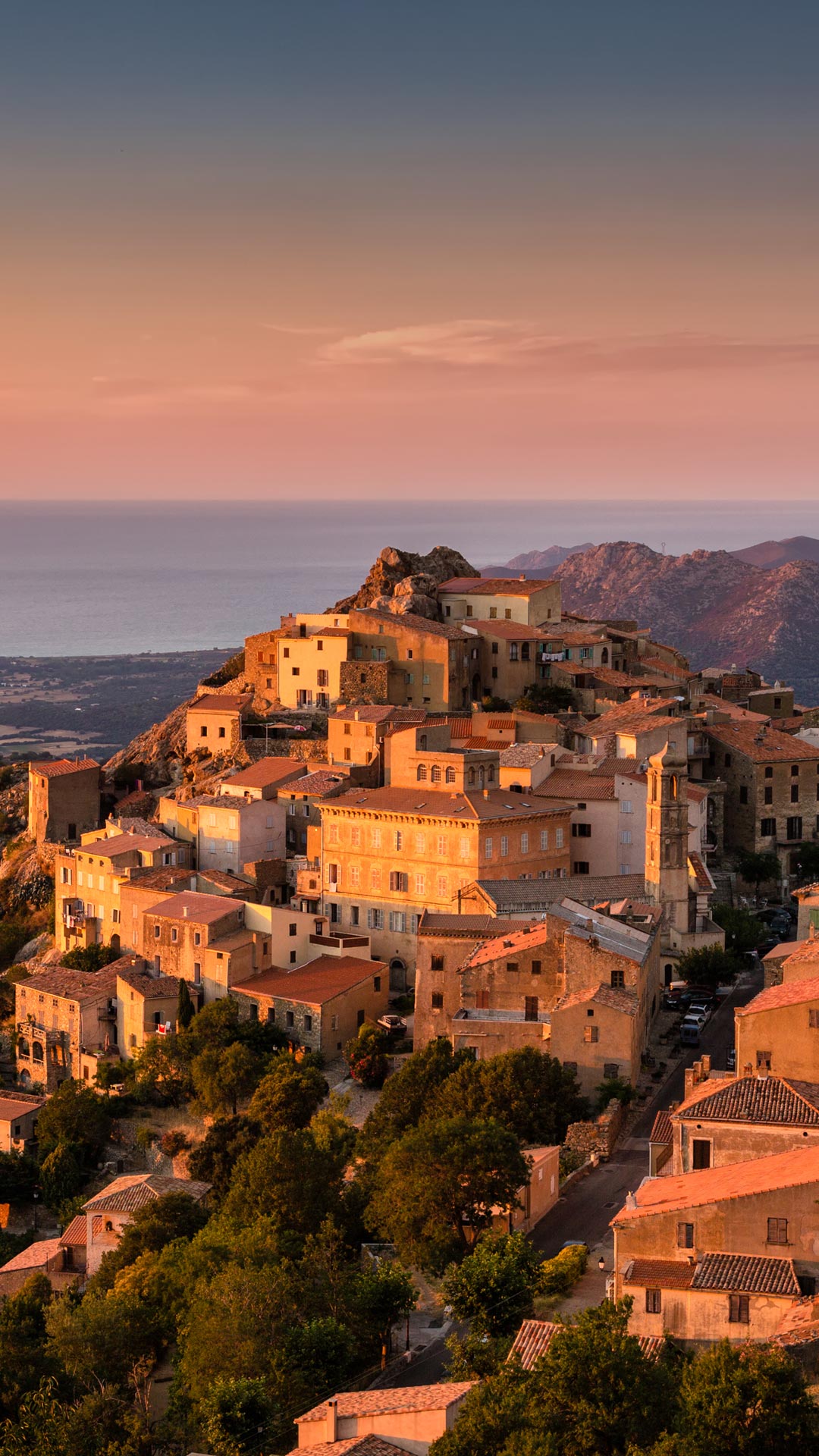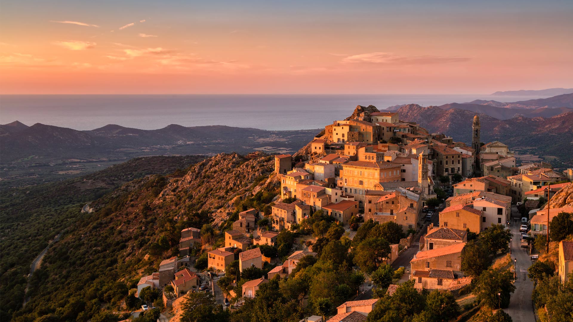 Soleil du soir sur le village perché de Speloncato en Corse (© joningall/iStock/Getty Images Plus) - Bing Wallpaper on July 8, 2020