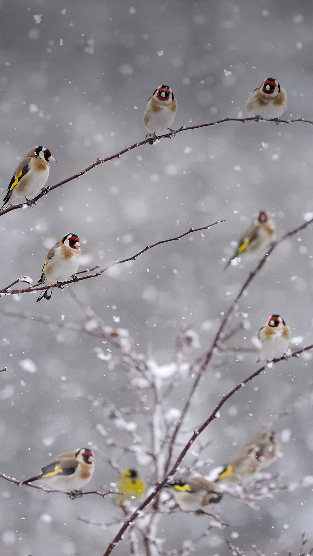 Chardonnerets élégants perchés sur des branches couvertes de neige (© Christophe Sidamon-Pesson/Minden) - Bing Wallpaper on December 26, 2021
