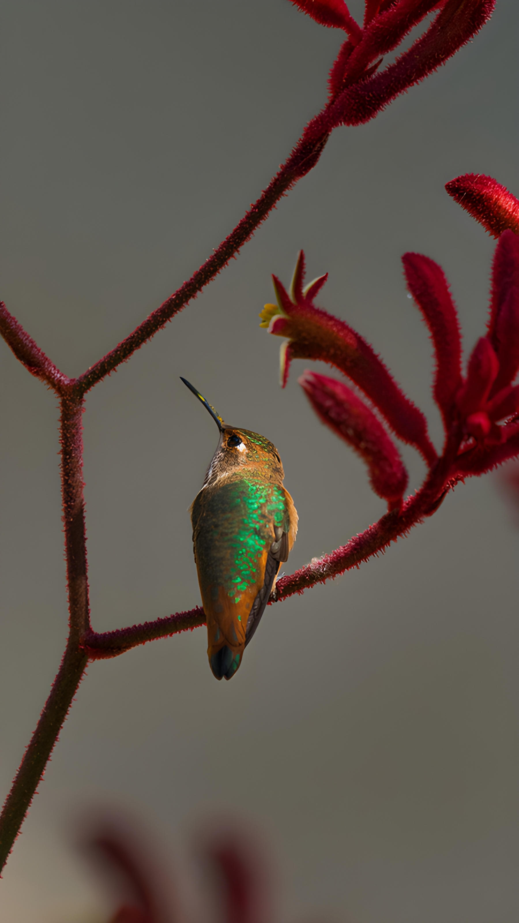 Colibri d'Allen perché sur la plante patte de kangourou rouge (© GypsyPictureShow/Shutterstock) - Bing Wallpaper on April 9, 2023