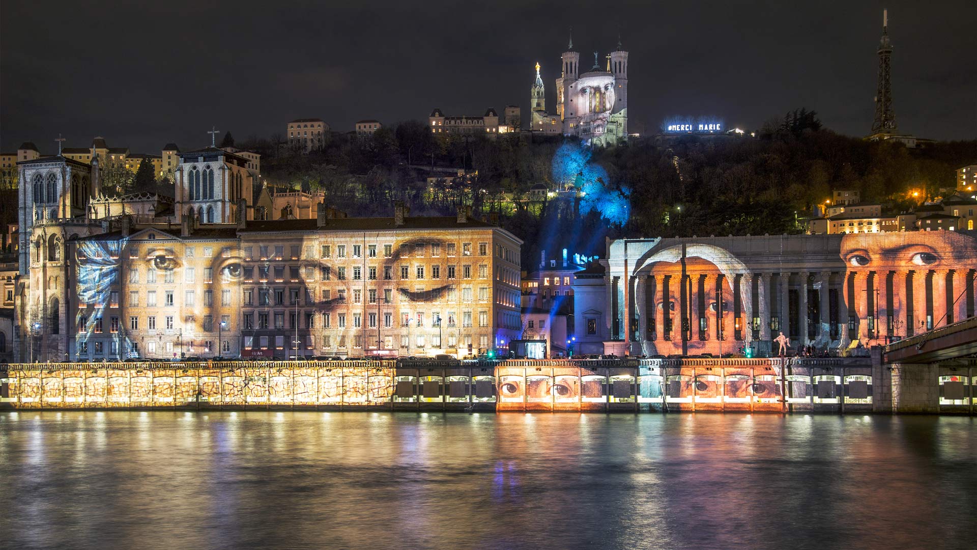 Fête des Lumières, œuvre d'art de Daniel Knipper, nommée Regards, en hommage aux victimes de l'attentat de Paris 2015, Lyon, France (© Baptiste de Izarra/Alamy Stock Photo) - Bing Wallpaper on December 7, 2023