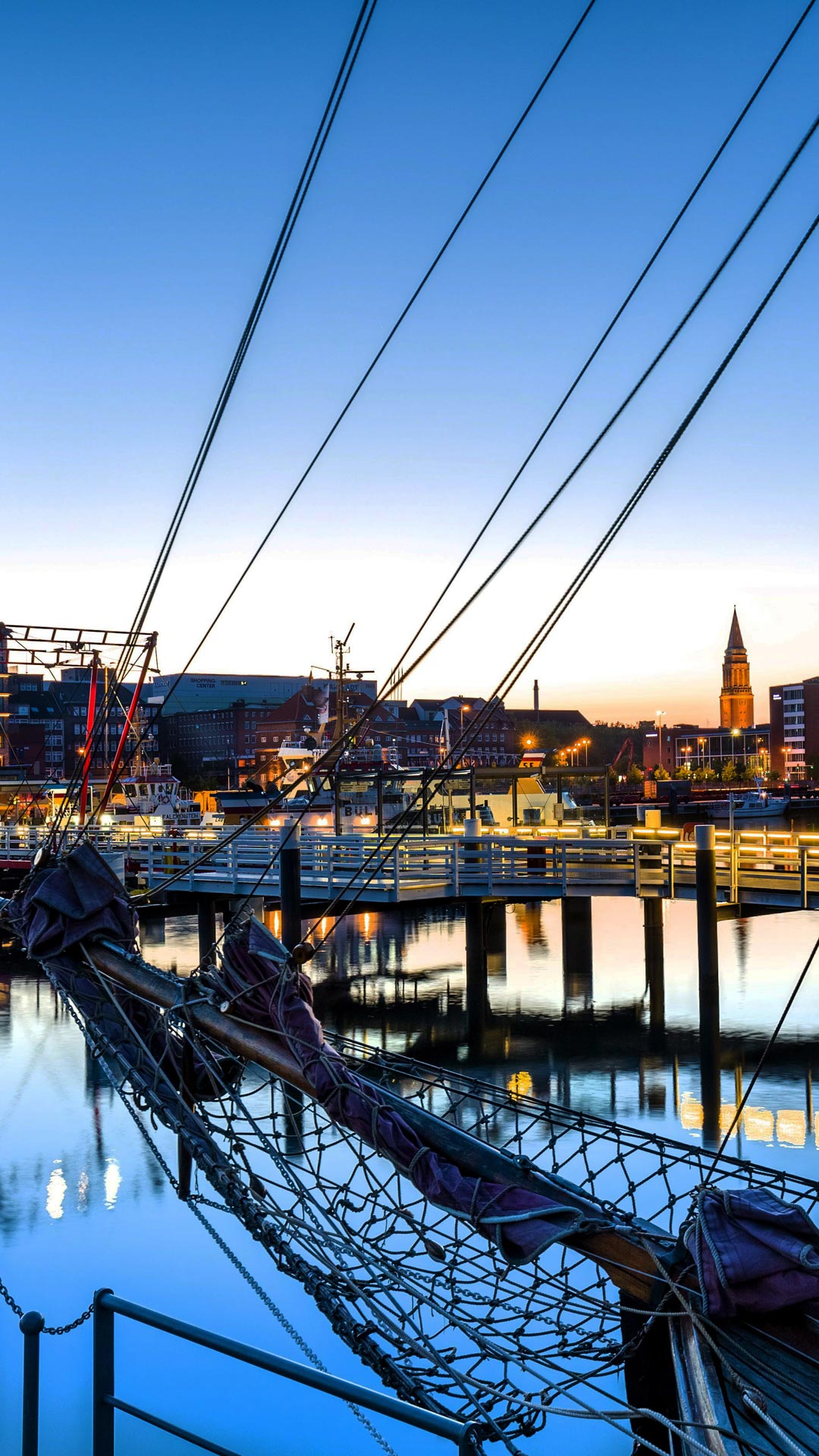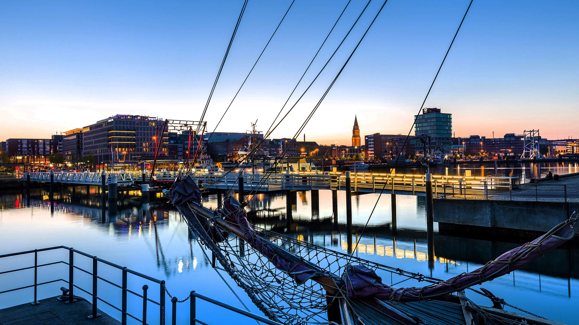 Hörnbrücke mit Stadtzentrum am Abend, Kiel, Schleswig-Holstein, Deutschland (© Sabine Lubenow/Huber Images/eStock Photo) - Bing Wallpaper on October 2, 2019