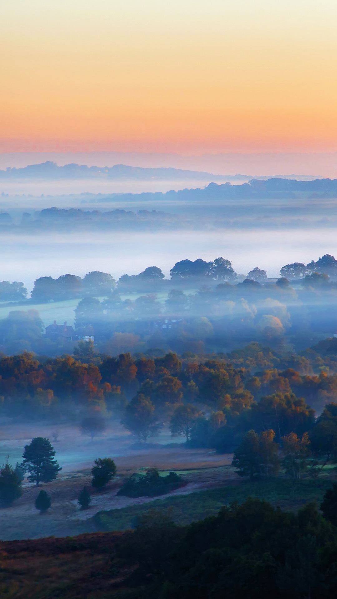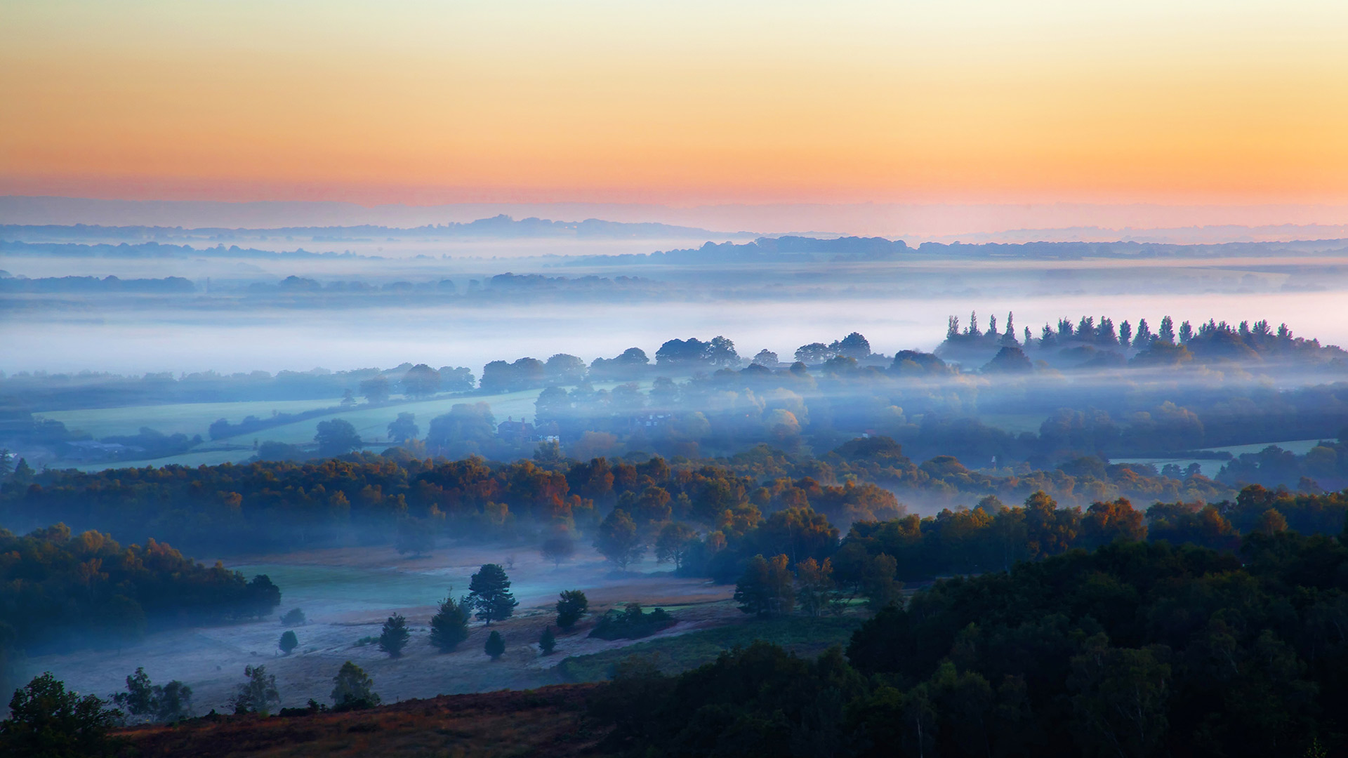 Sonnenaufgang bei Nebel im Ashdown Forest, East Sussex, England, Großbritannien (© Tim Stocker Photography/Getty Images) - Bing Wallpaper on October 13, 2019
