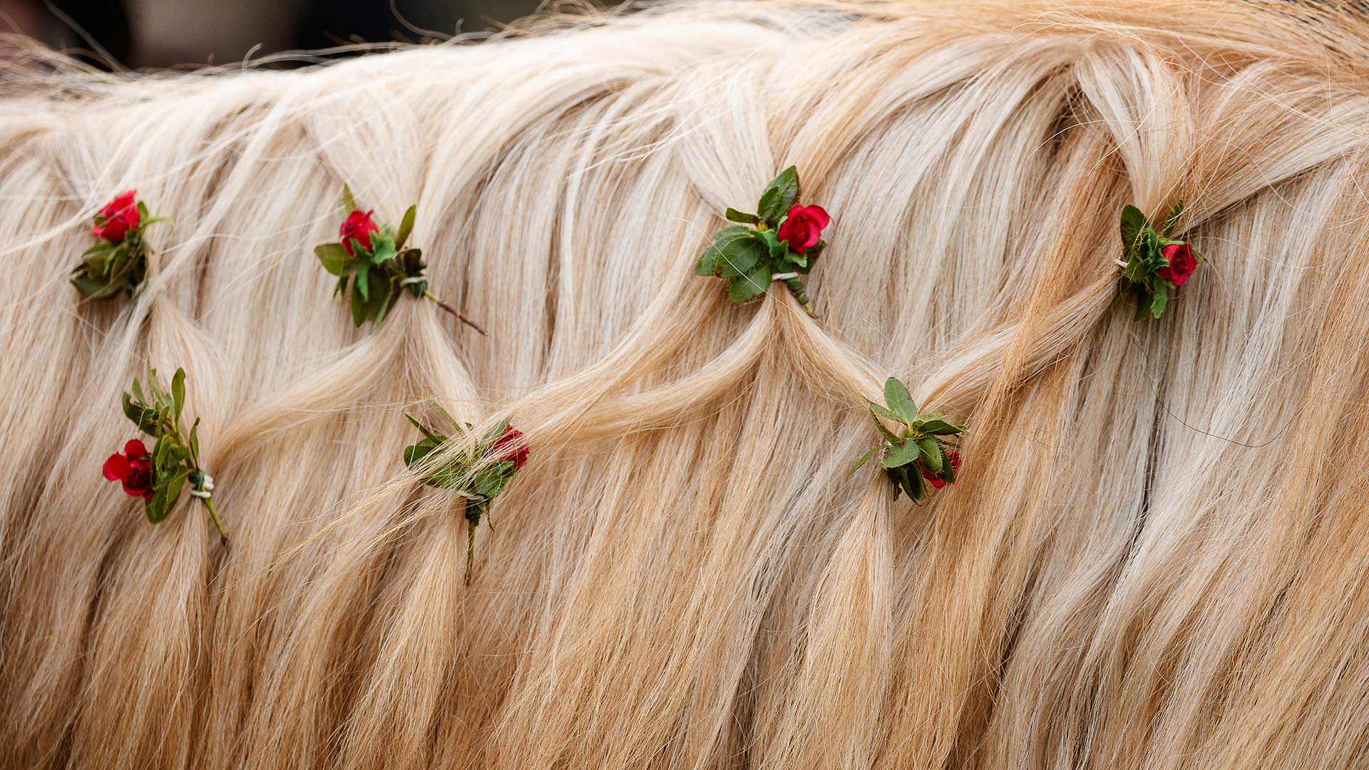 Die geschmückte Mähne eines Pferdes bei der jährlichen Leonhardifahrt entlang des Schliersees, Landkreis Miesbach, Bayern, Deutschland (© Marco Kost/Getty Images News) - Bing Wallpaper on November 2, 2019
