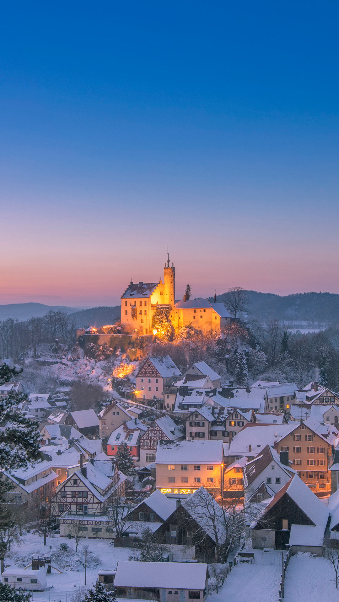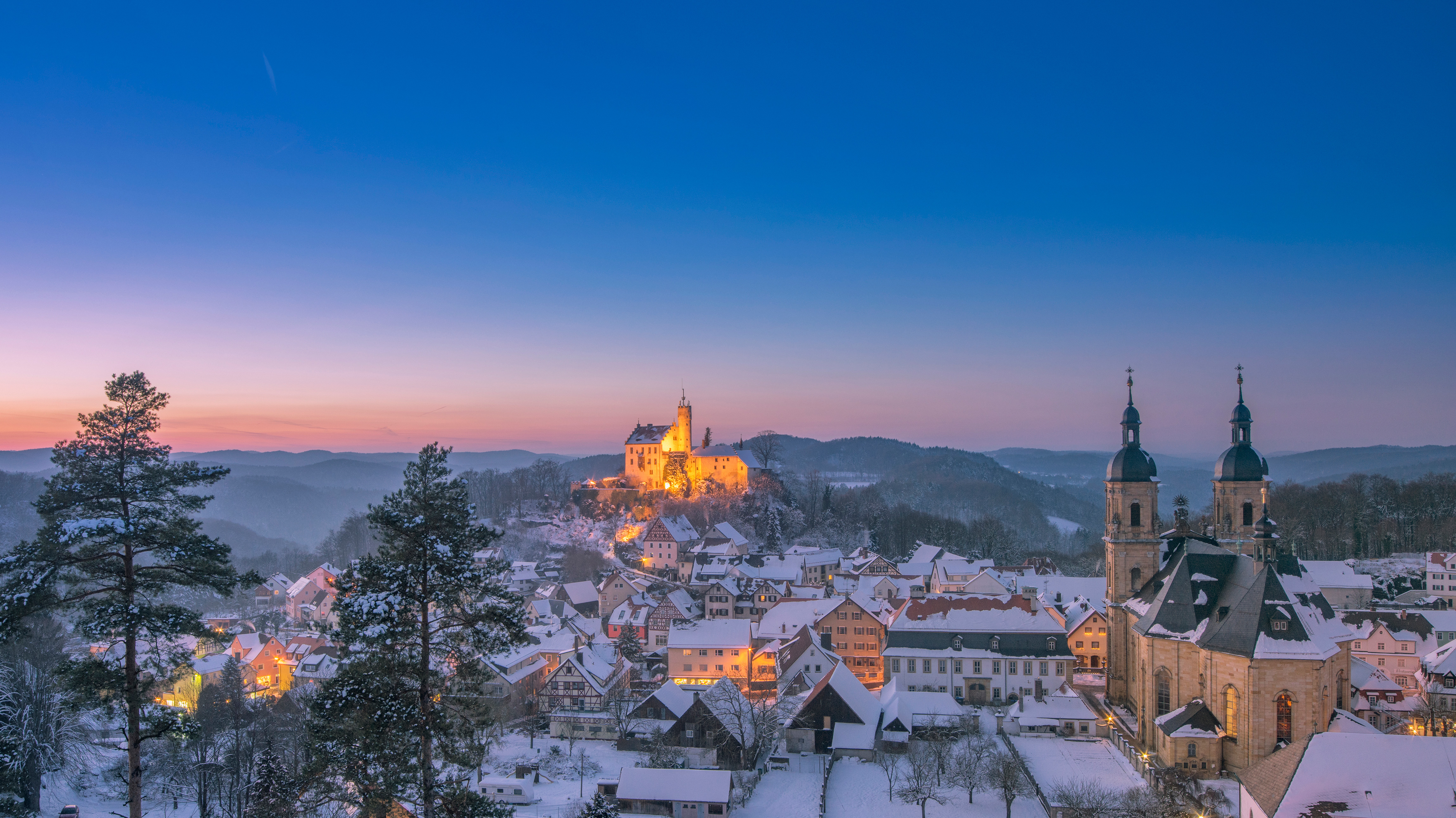 Blick auf die Gemeinde Gößweinstein mit der Burg Gößweinstein im Hintergrund, Fränkische Schweiz, Bayern (© Juergen Sack/Getty Images) - Bing Wallpaper on January 3, 2021