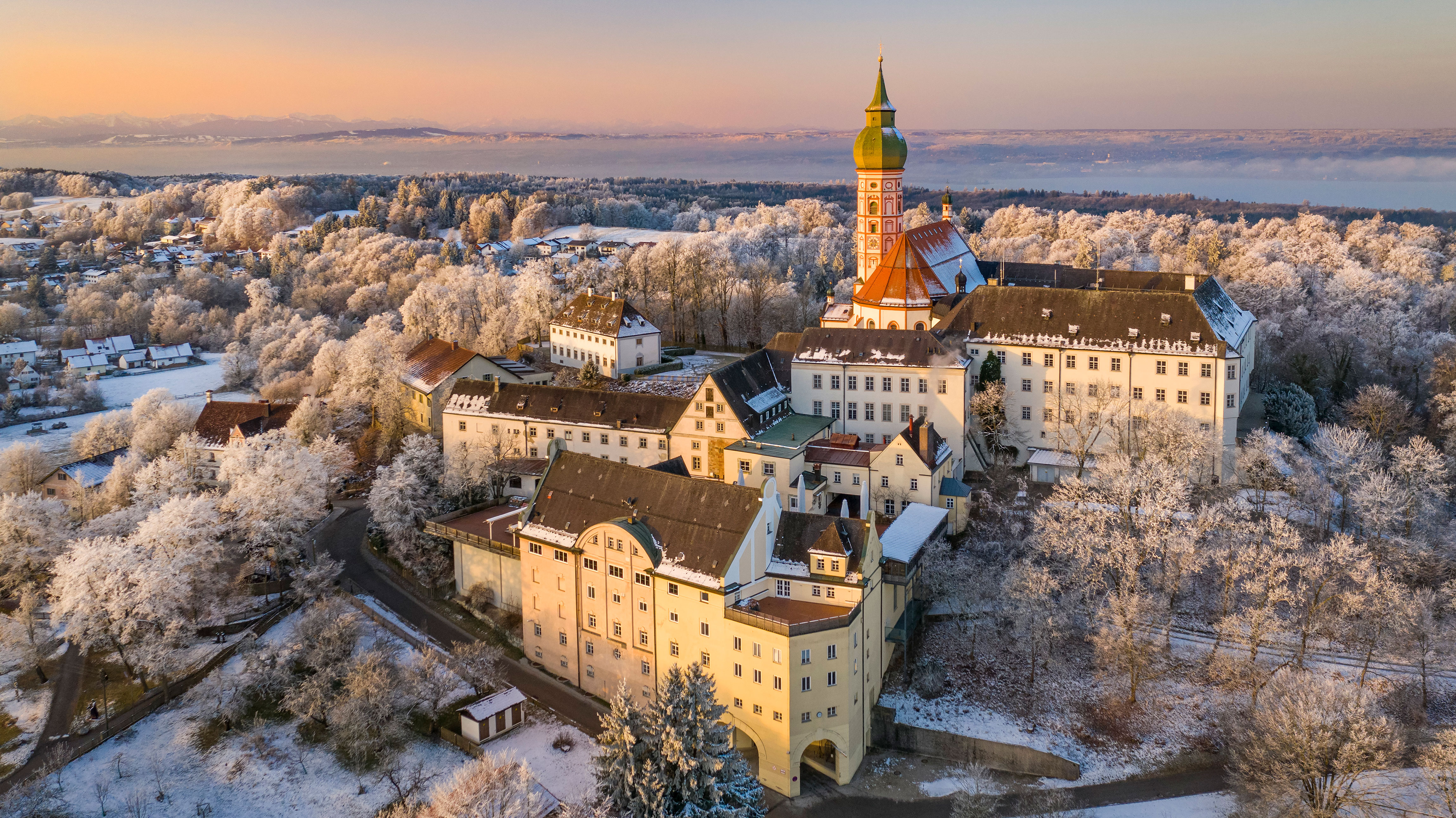 Winterliche Morgenstimmung am Kloster Andechs in Bayern mit Blick auf den Ammersee (© Reinhard Schmid/Huber/eStock Photo) - Bing Wallpaper on February 22, 2021