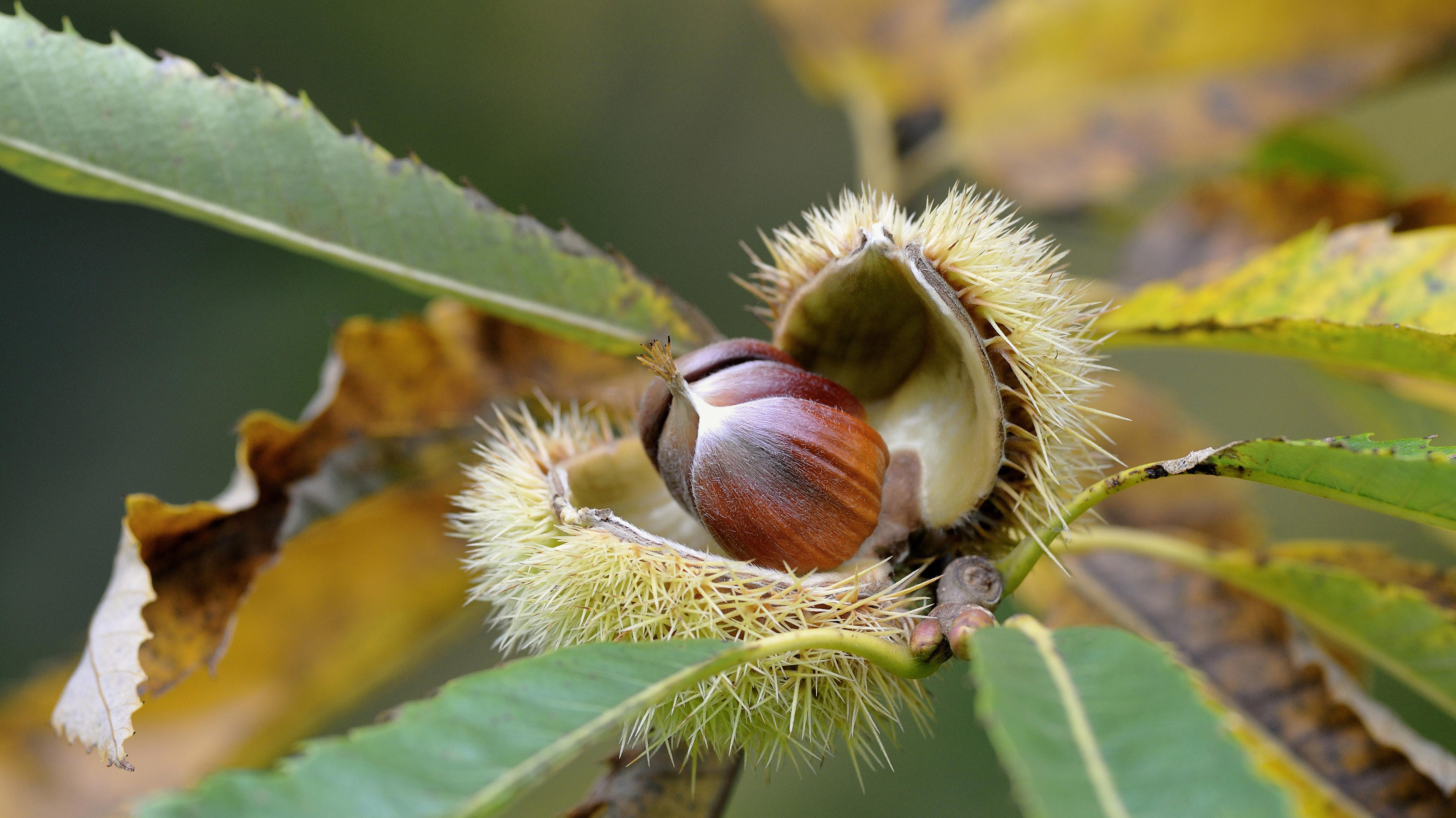 Reife Früchte einer Edelkastanie, Nordrhein-Westfalen (© Frederik/imageBROKER/Shutterstock) - Bing Wallpaper on October 2, 2021