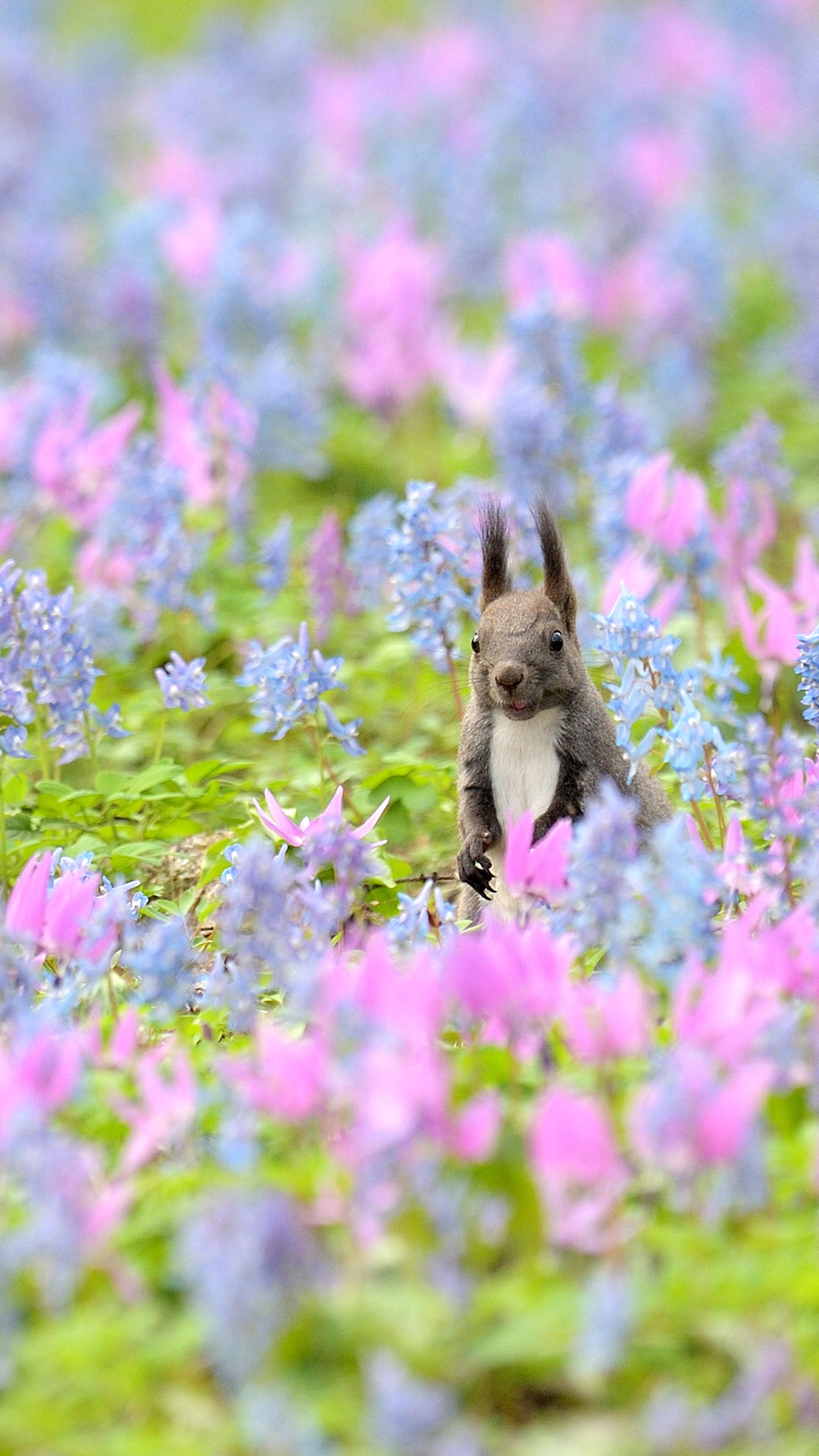 エゾリスとカタクリ、エゾエンゴサクの花, 北海道 浦臼神社 (© Akira Sato/500px/Getty Images) - Bing Wallpaper on March 12, 2022