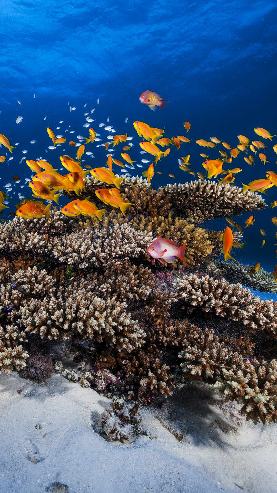School of Pseudanthias squamipinnis swimming over coral, Mayotte, Indian Ocean (© Gabriel Barathieu/Minden Pictures) - Bing Wallpaper on June 30, 2019
