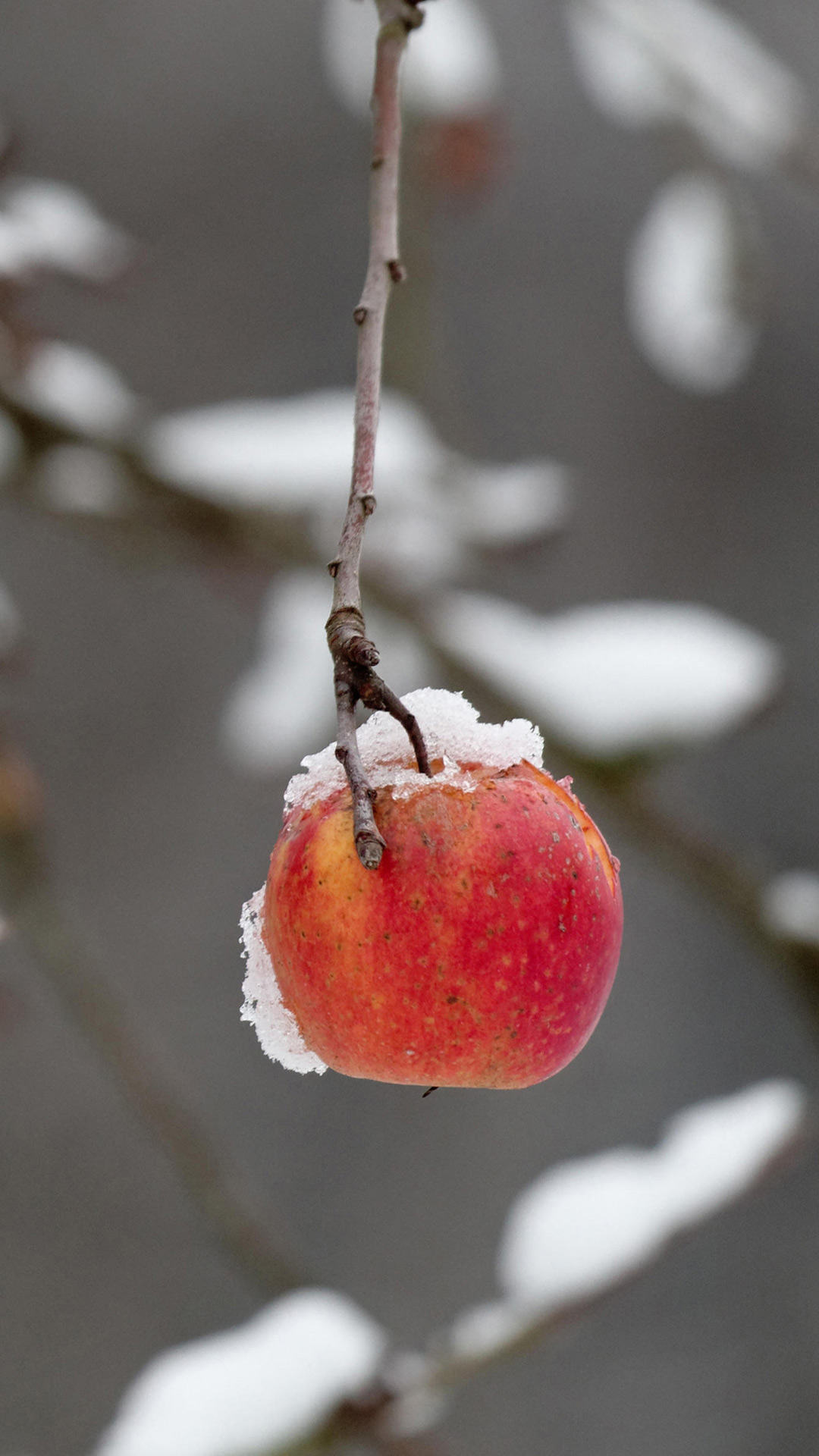 一枚红苹果挂在被大雪压断的树枝上 (© griangraf/iStock/Getty Images) - Bing Wallpaper on January 9, 2020