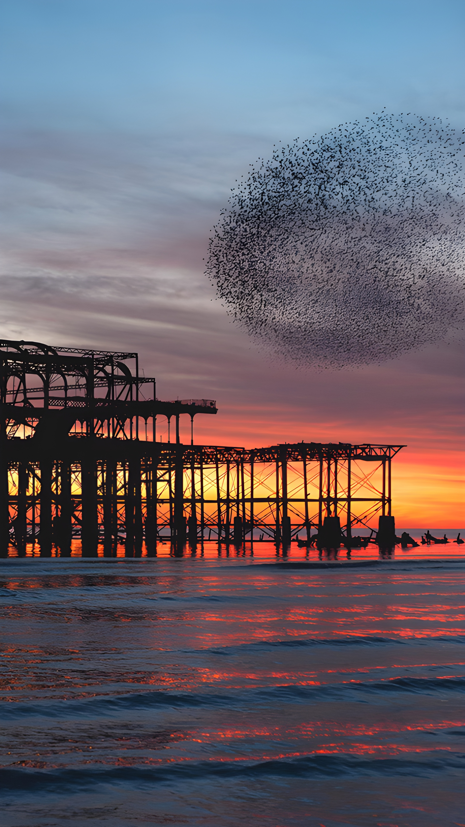 Starling murmuration over the ruins of Brighton's West Pier, England (© Philip Reeve/Photodisc/Getty Images) - Bing Wallpaper on October 12, 2025