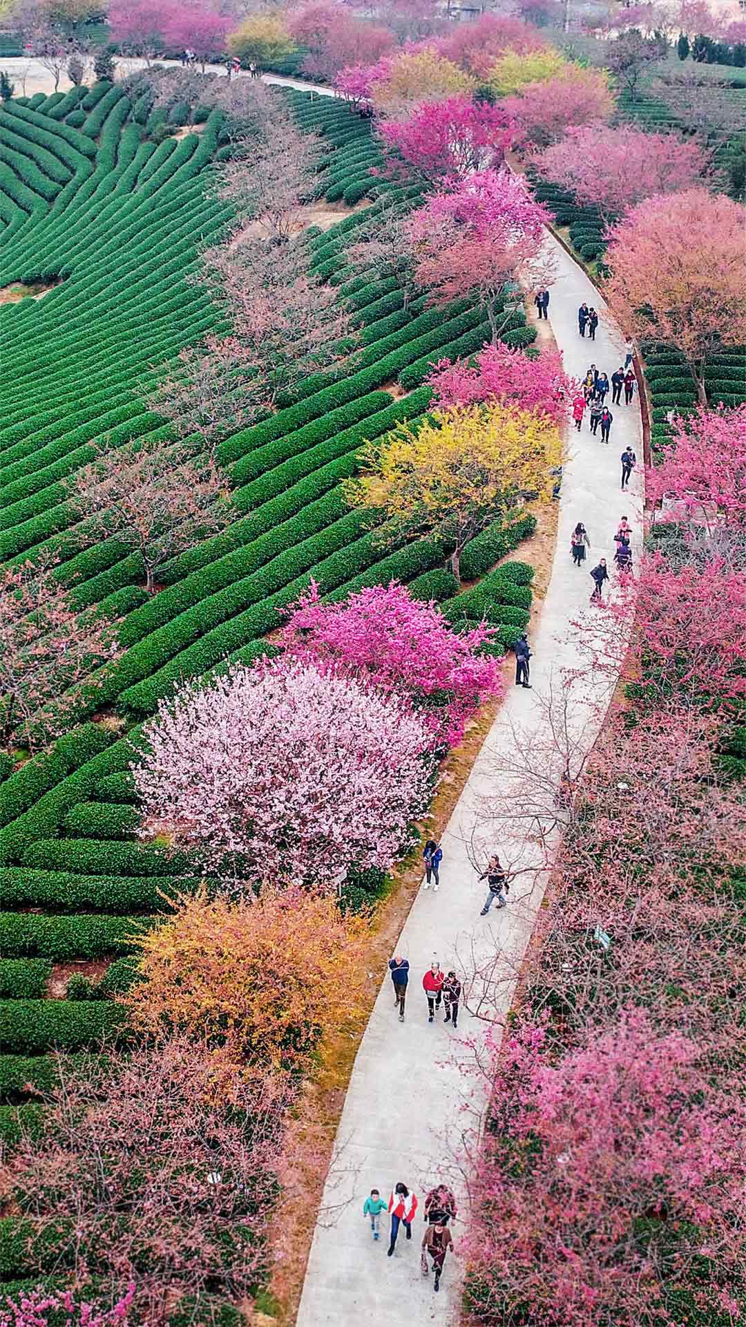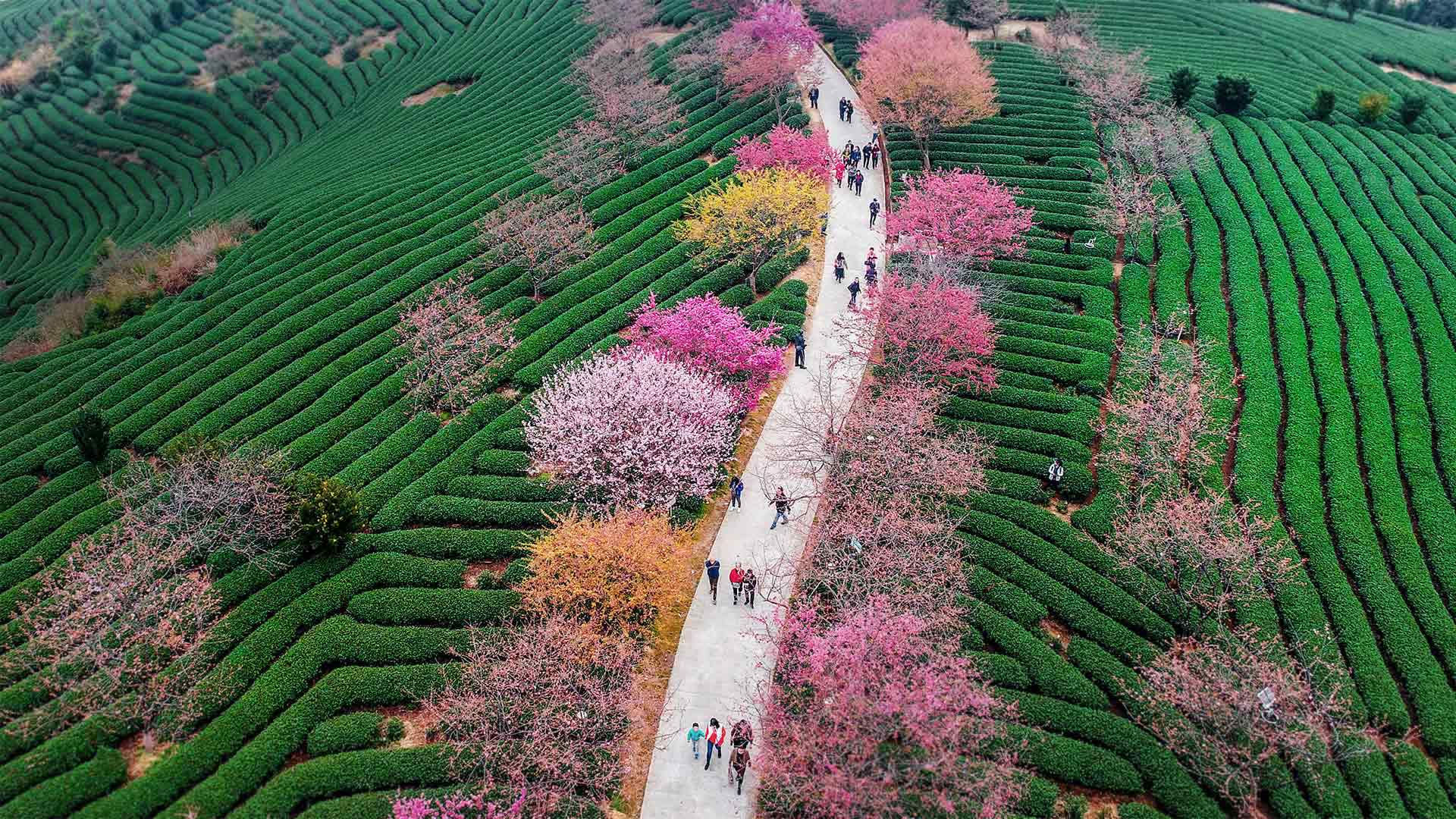 Blossoming cherry trees at a tea plantation in Longyan, China (© VCG/Getty Images) - Bing Wallpaper on April 5, 2019