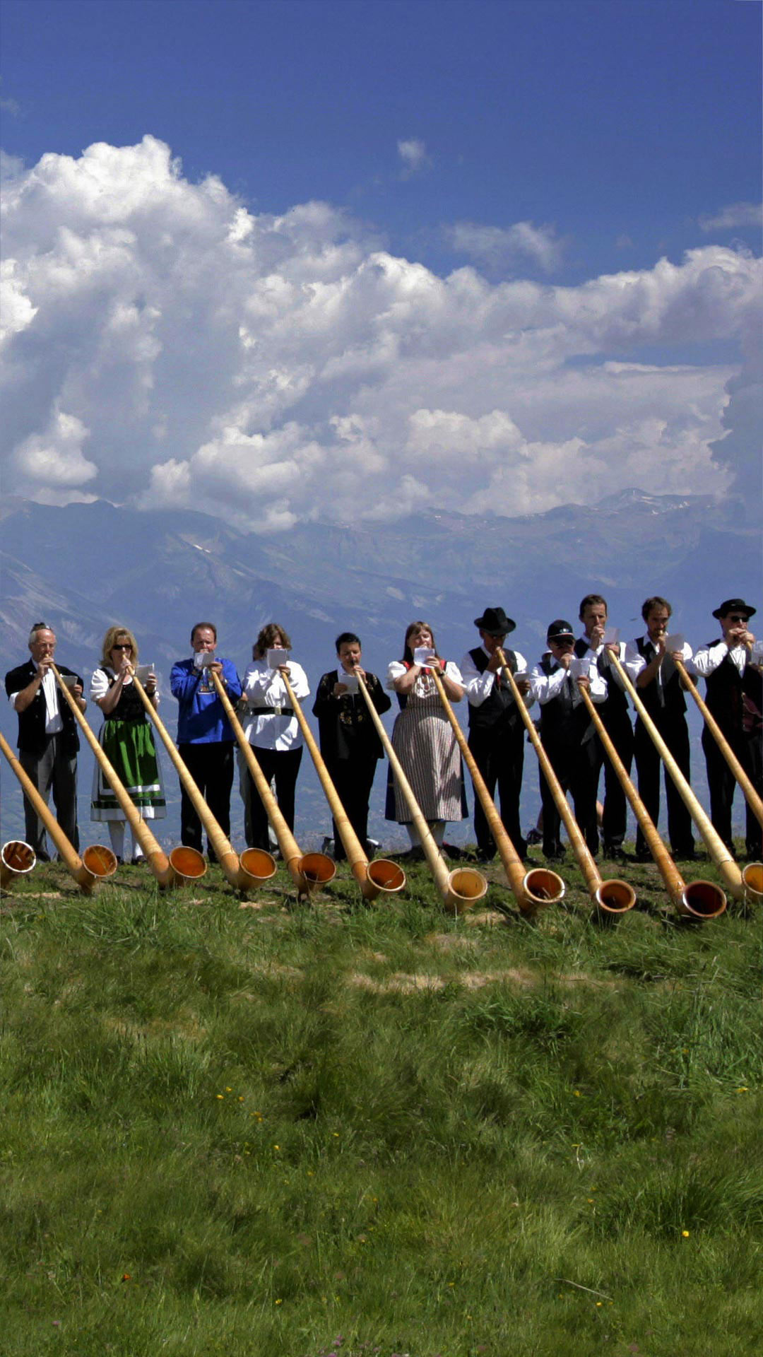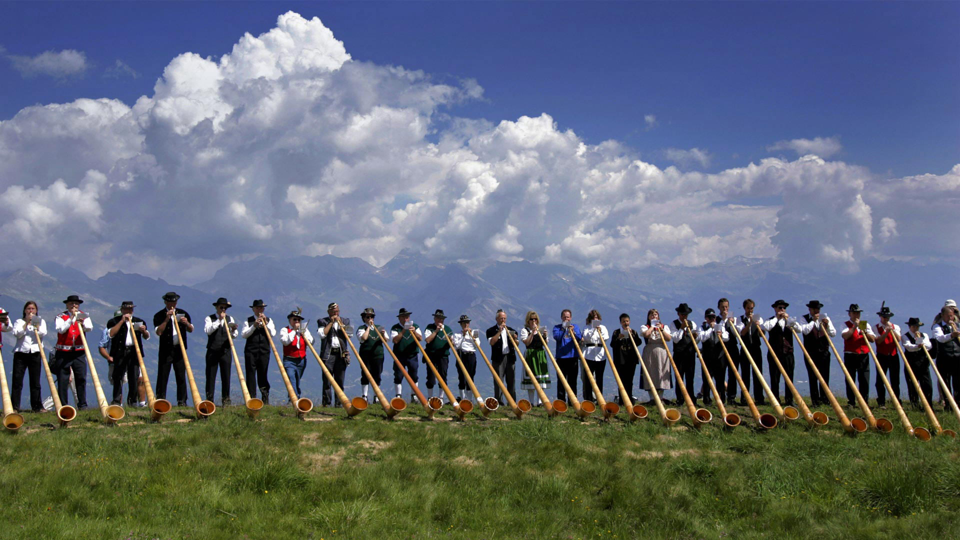 Alphorn musicians perform during the International Alphorn Festival in Nendaz, Switzerland (© Fabrice Coffrini/Getty Images) - Bing Wallpaper on July 26, 2019