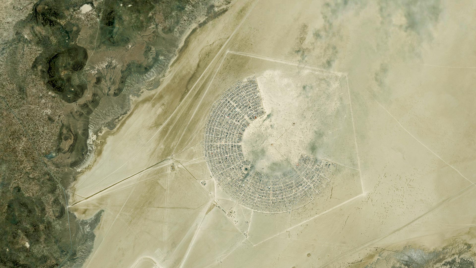 Satellite image of the Burning Man festival in Black Rock City, Nevada (© DigitalGlobe/ScapeWare3d/Getty Images) - Bing Wallpaper on August 25, 2019