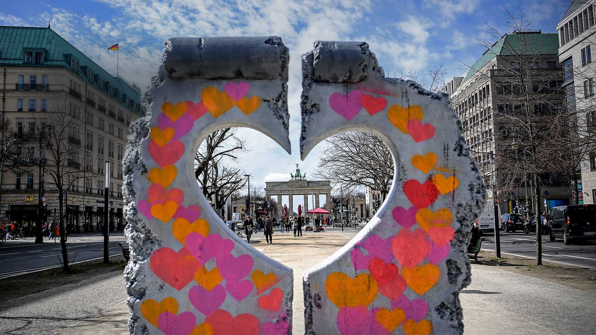 The Brandenburg Gate seen through a heart-shaped replica of a remnant of the Berlin Wall (© Britta Pedersen/picture alliance via Getty Images) - Bing Wallpaper on November 9, 2019