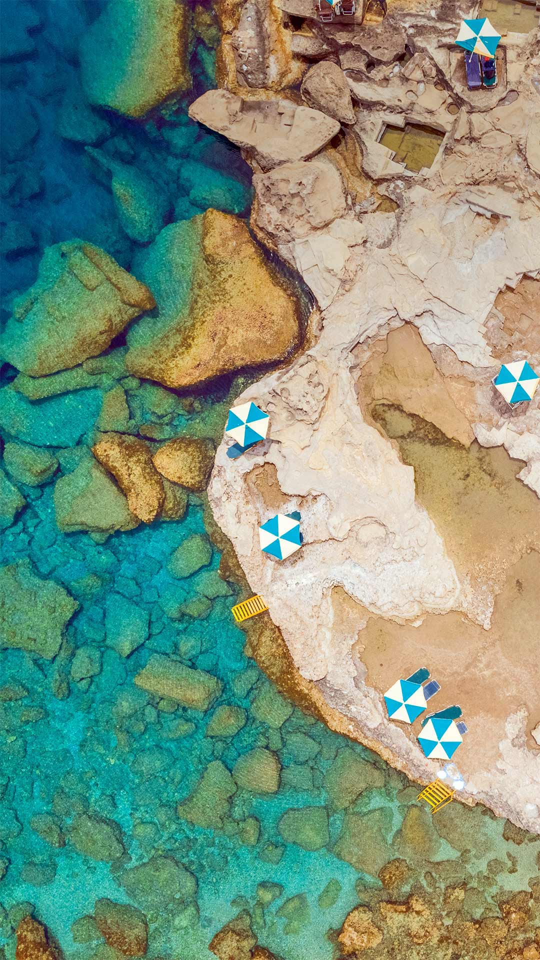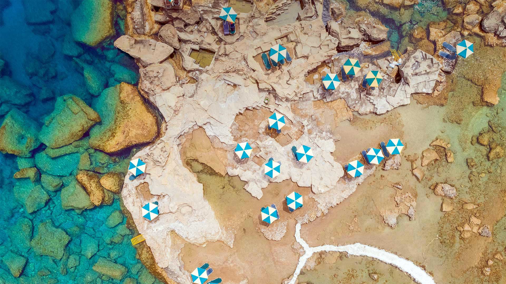 Aerial view of blue and white parasols on the rocky coast of Rhodes, an island in Greece (© Amazing Aerial Agency/Offset by Shutterstock) - Bing Wallpaper on July 2, 2020