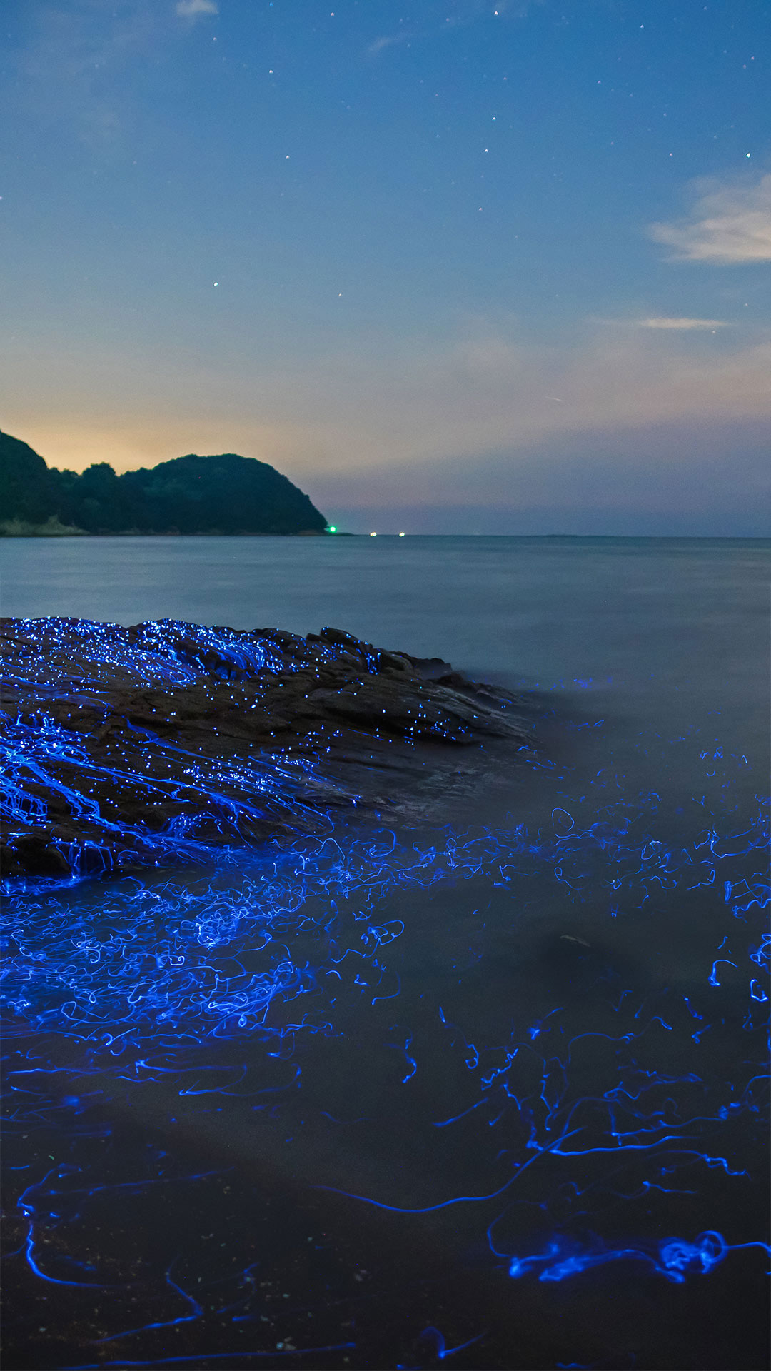 Bioluminescent sea fireflies along the shore of Okayama, Japan (© tdub_video/Getty Images) - Bing Wallpaper on August 11, 2020