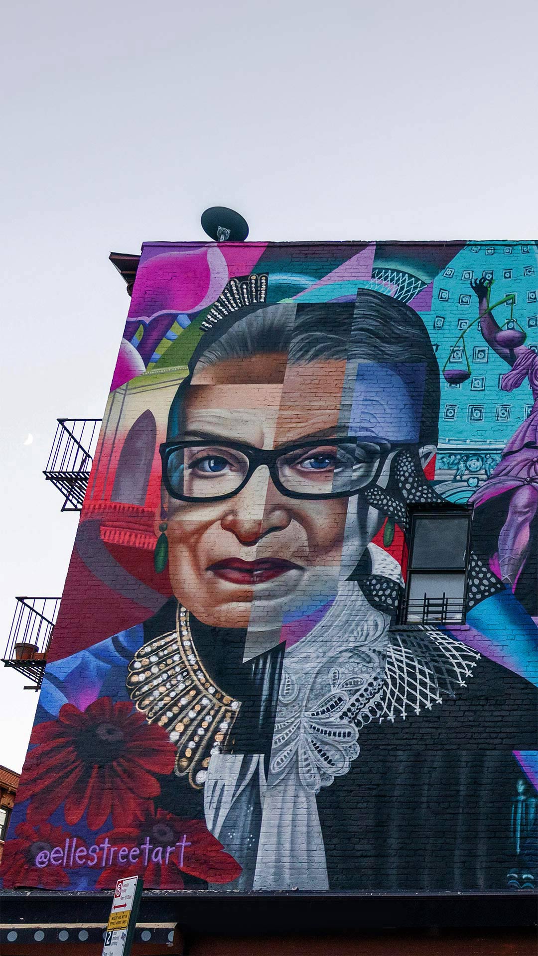 View of the Notorious RBG mural by the street artist Elle in New York City (© lev radin/Alamy) - Bing Wallpaper on March 8, 2021