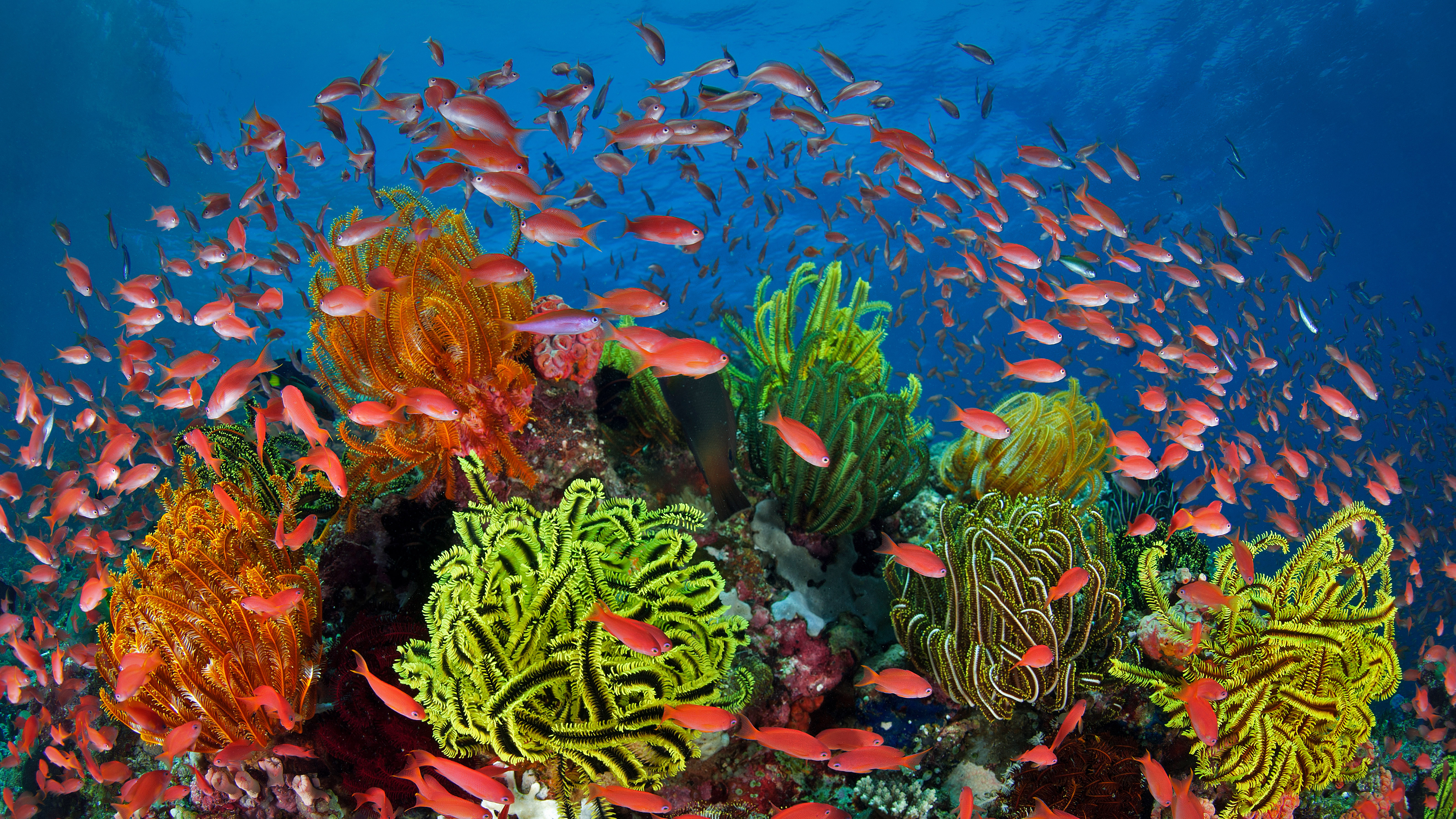 School of sea goldies with feather stars, Great Barrier Reef, Queensland, Australia (© Gary Bell/Minden Pictures) - Bing Wallpaper on July 28, 2021
