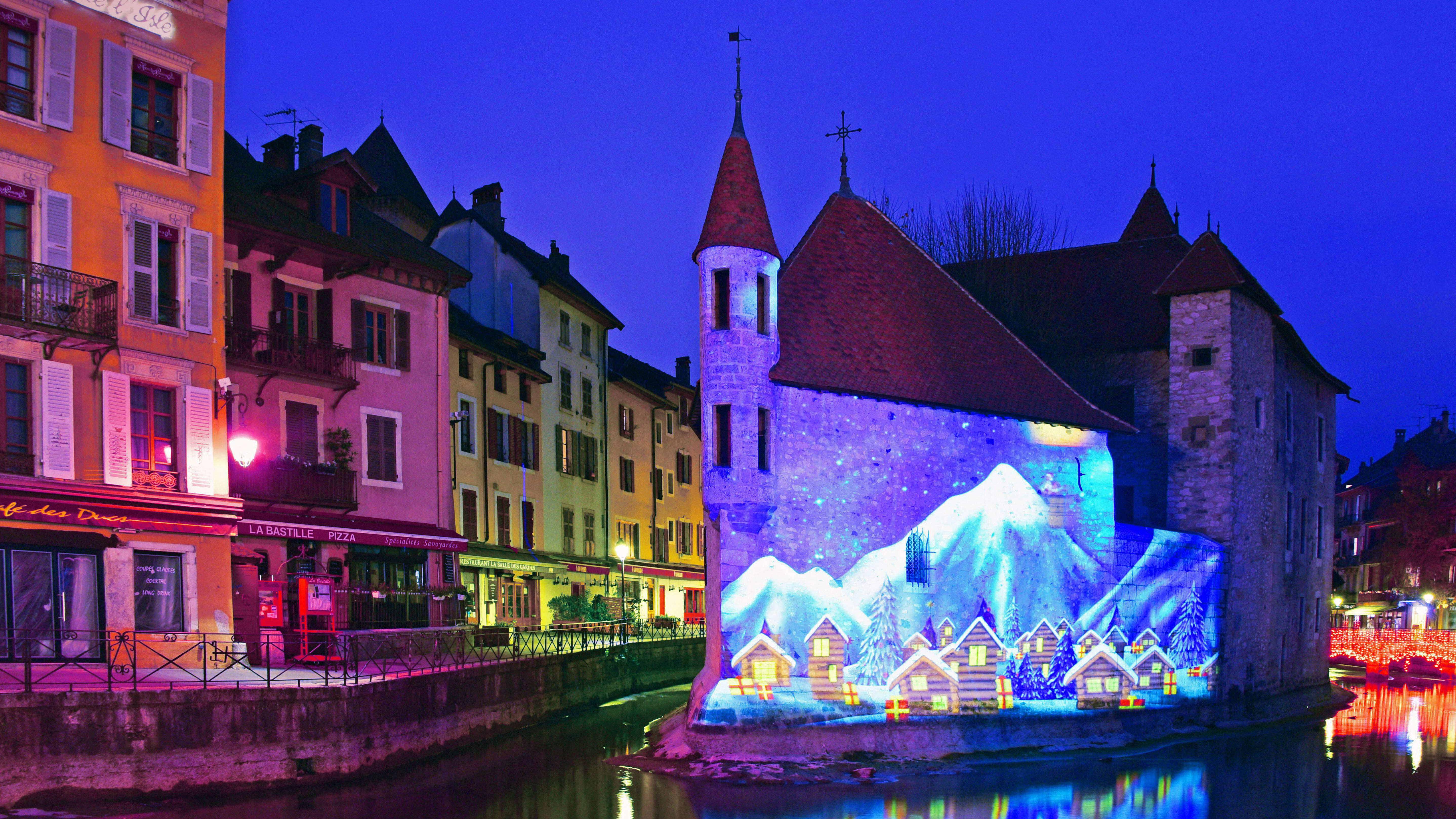 Winter scene illuminated on the Palais de l'Isle in Annecy, Haute Savoie, France (© blickwinkel/Alamy) - Bing Wallpaper on December 22, 2021
