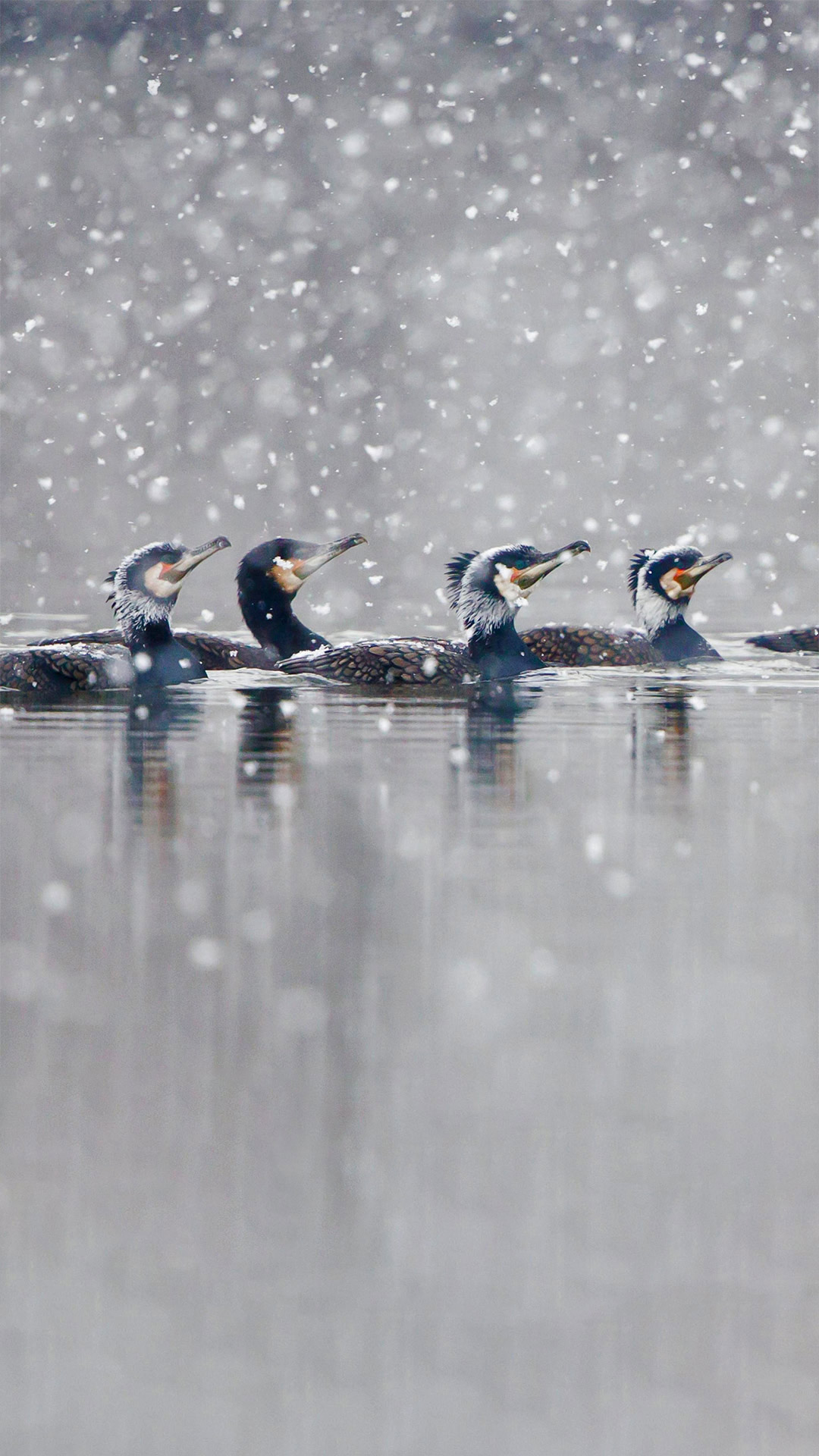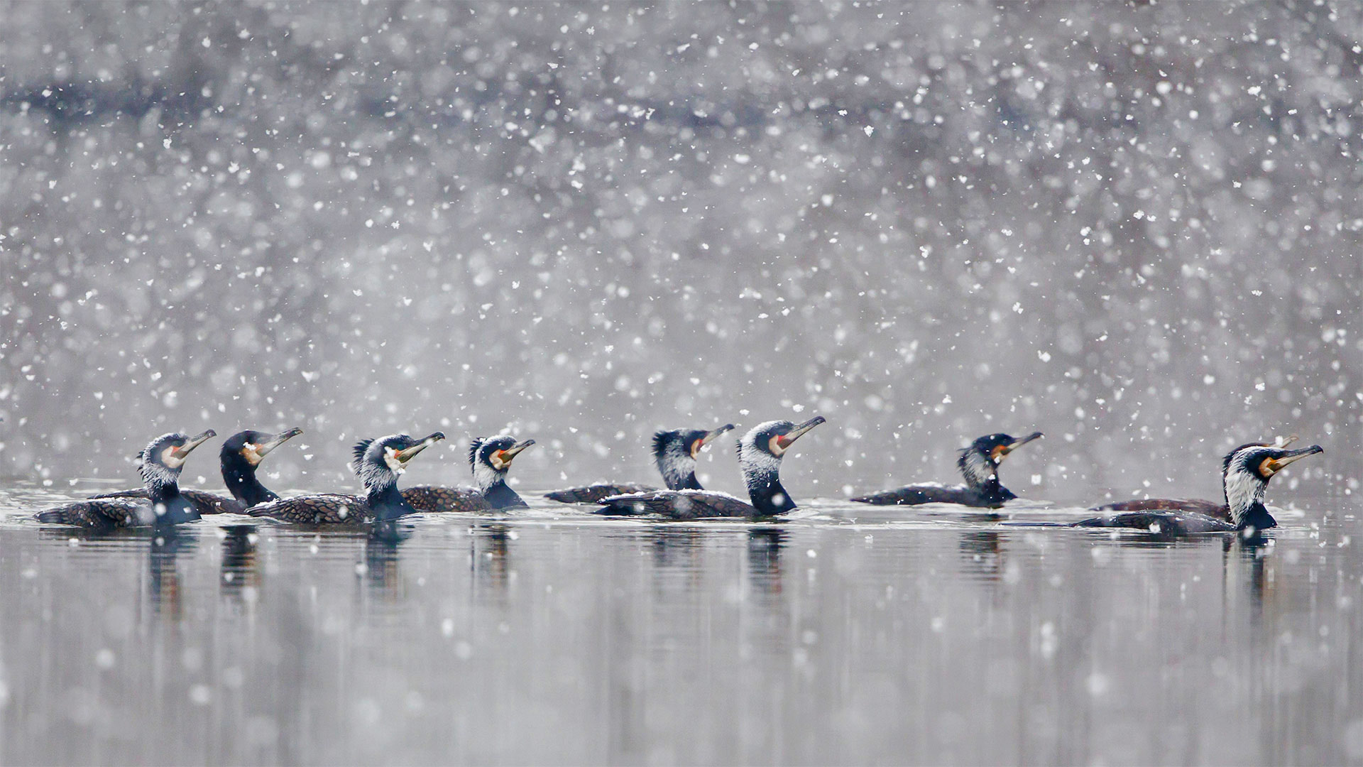 Great cormorants gliding through a snowstorm in Hesse, Germany (© Wilfried Martin/Getty Images) - Bing Wallpaper on March 6, 2022