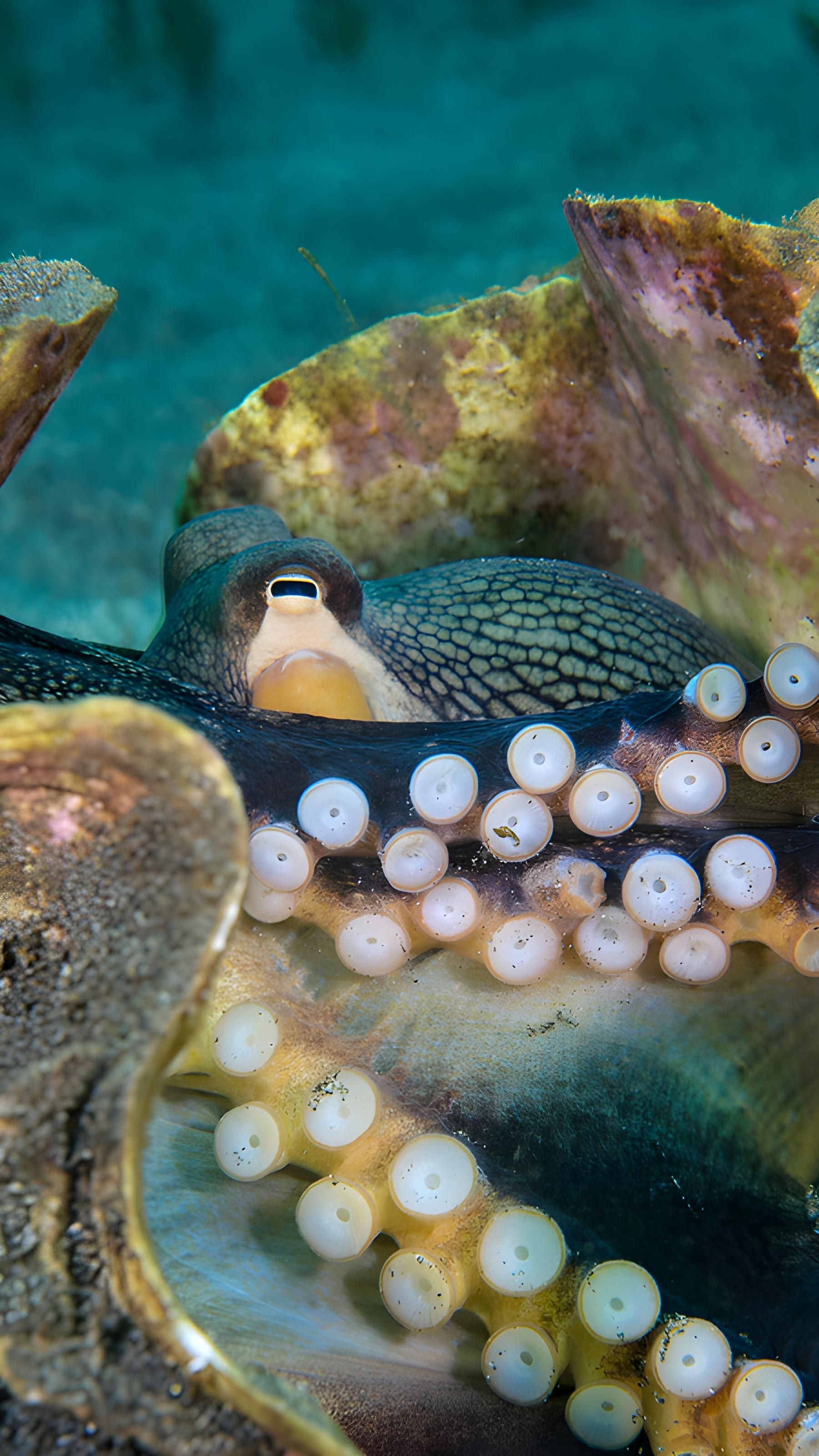 Veined octopus in a giant clam shell, Sulawesi Sea, Indonesia (© Alex Mustard/Minden Pictures) - Bing Wallpaper on October 8, 2023