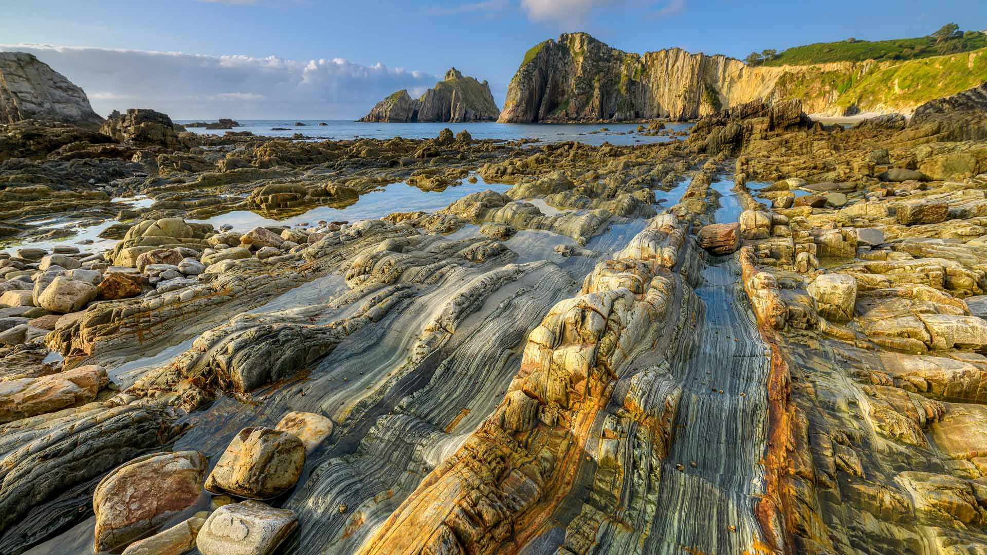 Quartzite formation, Playa del Silencio, Asturias, Spain (© Jean-Philippe Delobelle/Minden Pictures) - Bing Wallpaper on November 5, 2023