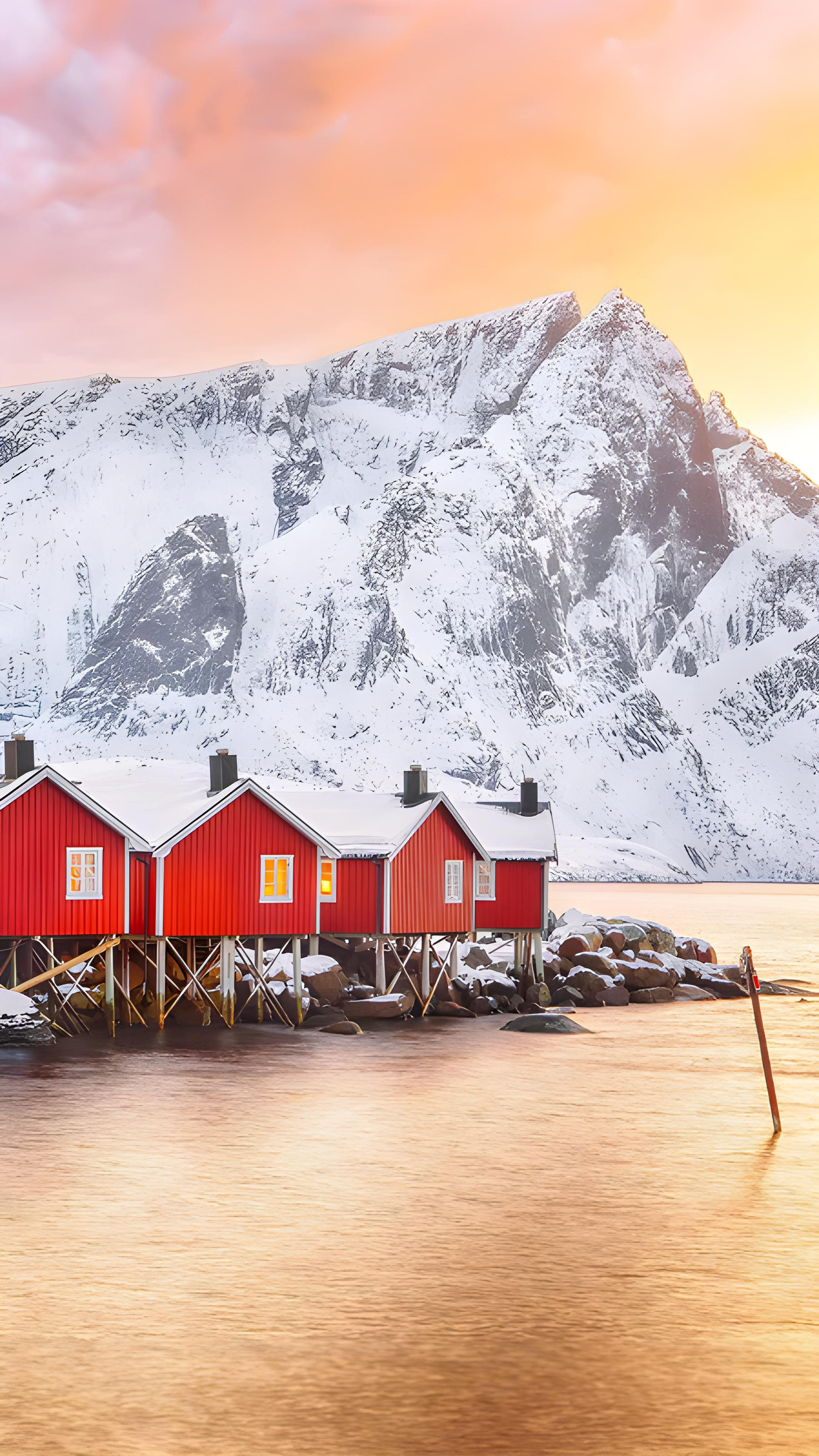 Traditional red fishermen's cabins on the shore of Reinefjorden, Norway (© Pilat666/Getty Images) - Bing Wallpaper on December 17, 2024